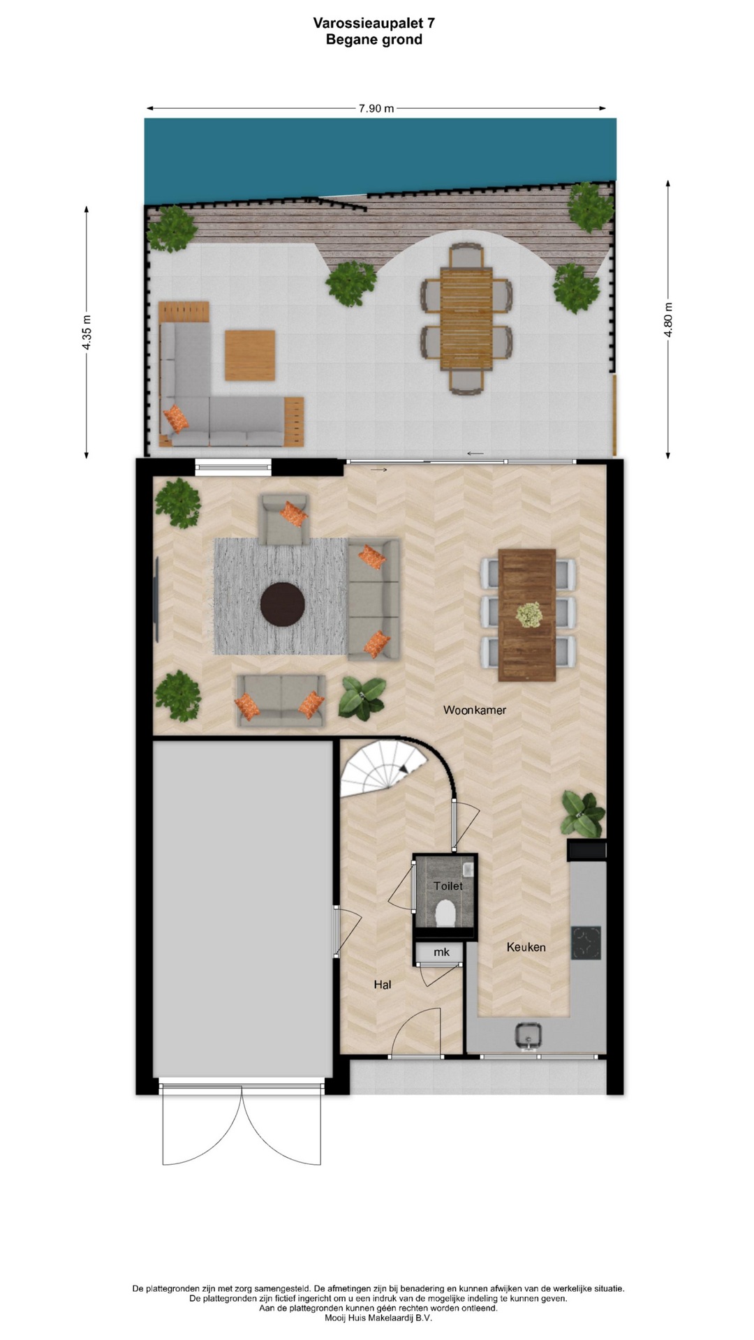 - Het terras is ruim opgezet met voldoende ruimte voor een loungeset en buitentafel. Het terras is deels betegeld en deels voorzien van vlonders