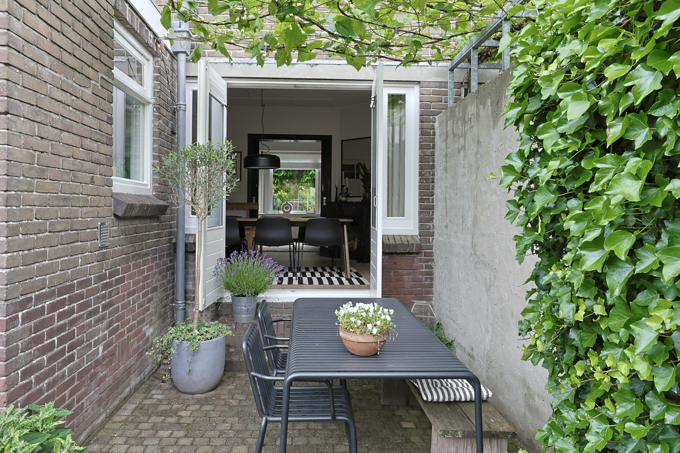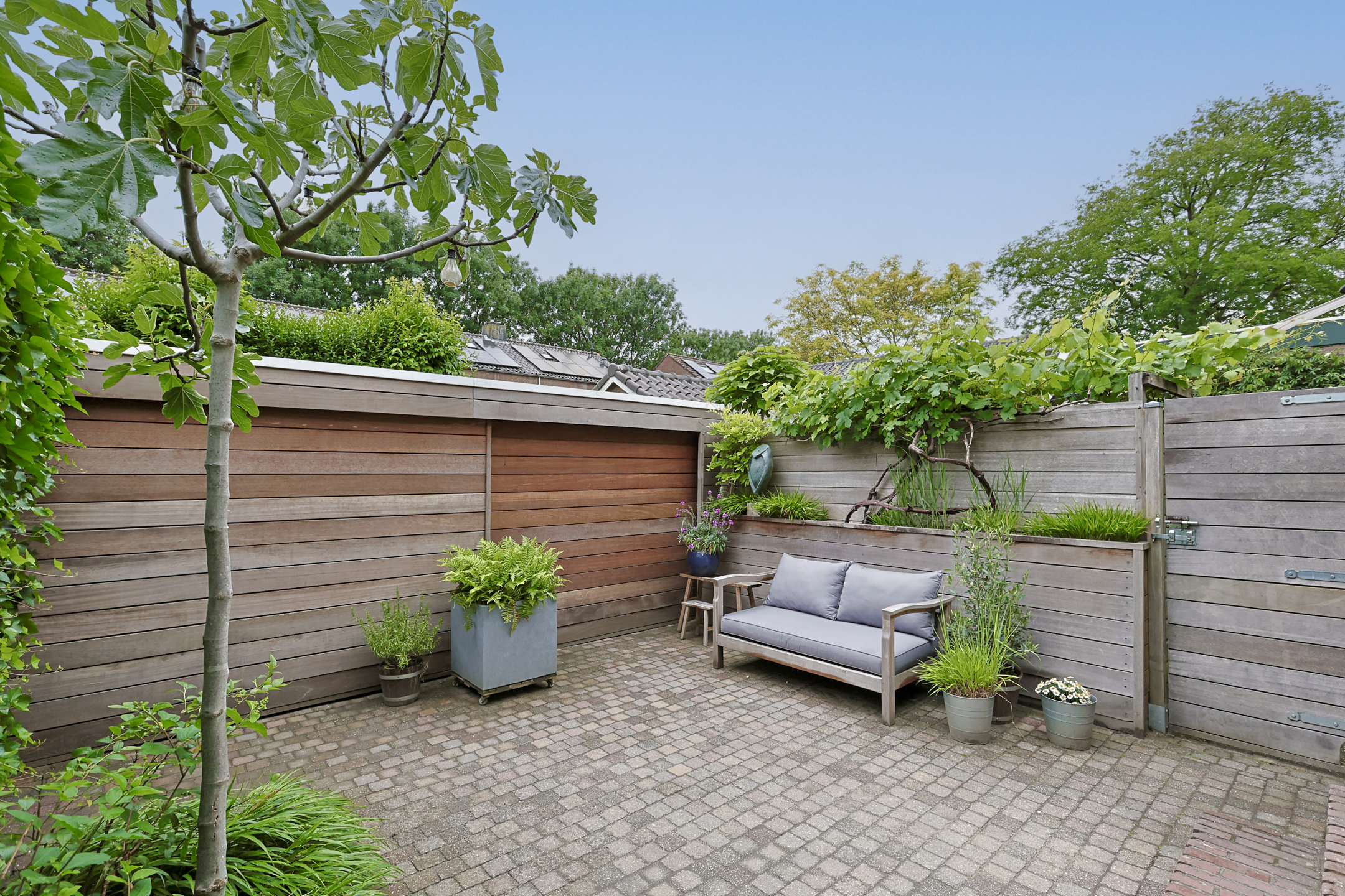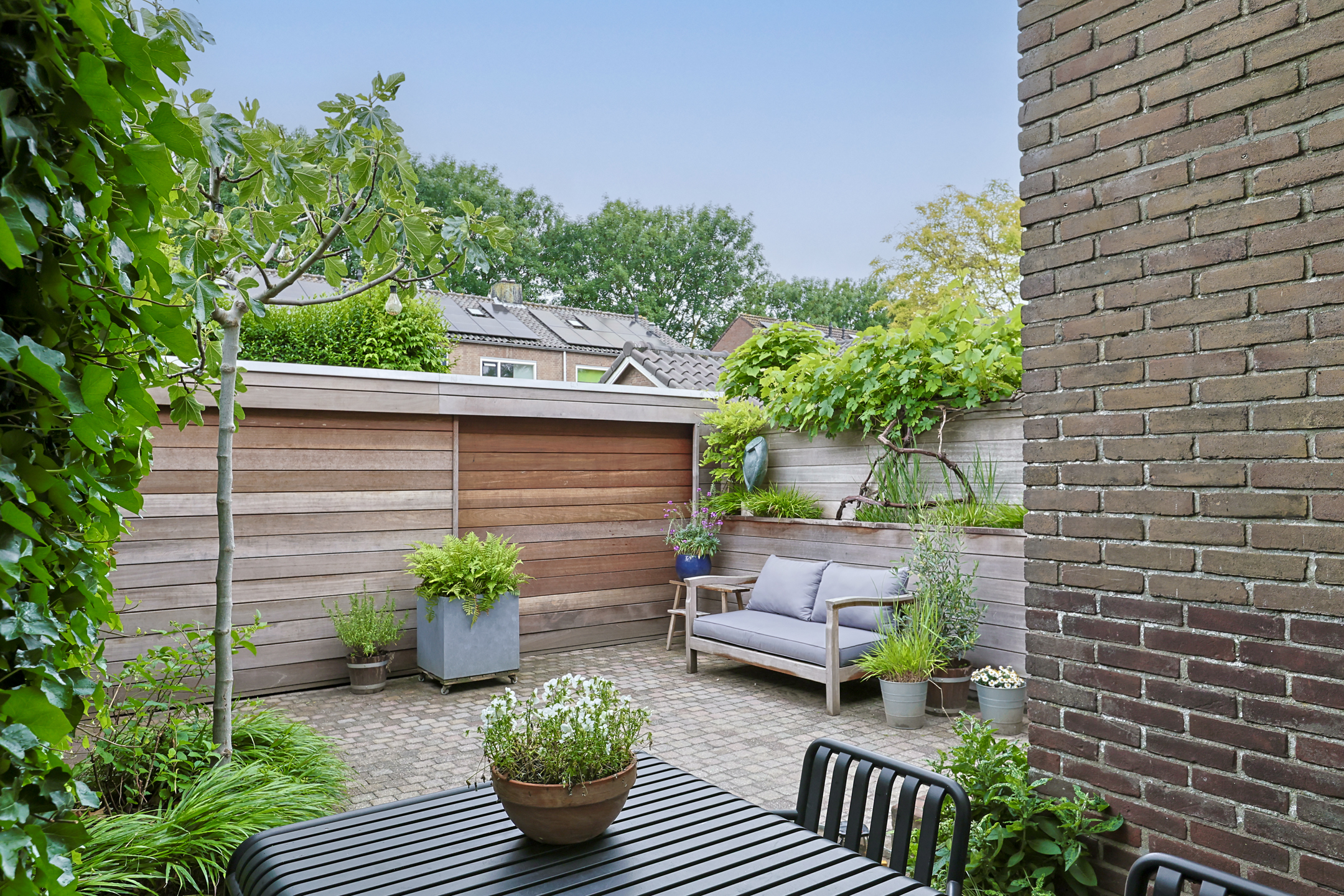 De achtertuin (op het westen) is een zonnige en groene stadstuin met meerdere zitplekken, een hardhouten berging (2021) voorzien van licht en elektra en een achterom direct naast het huis.
