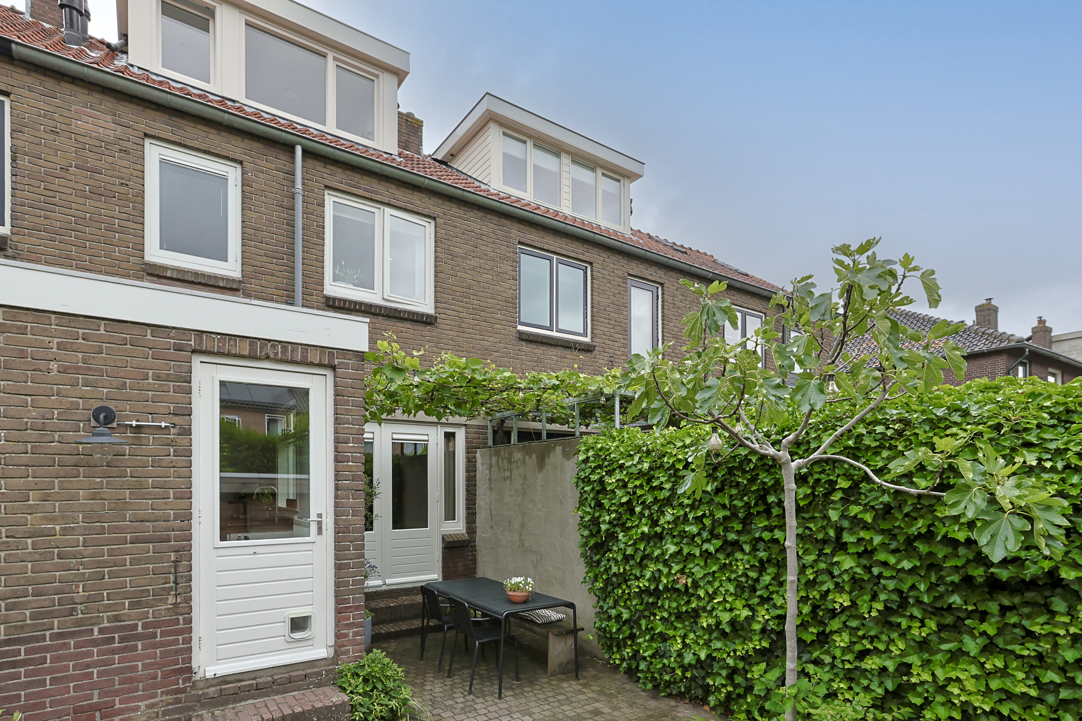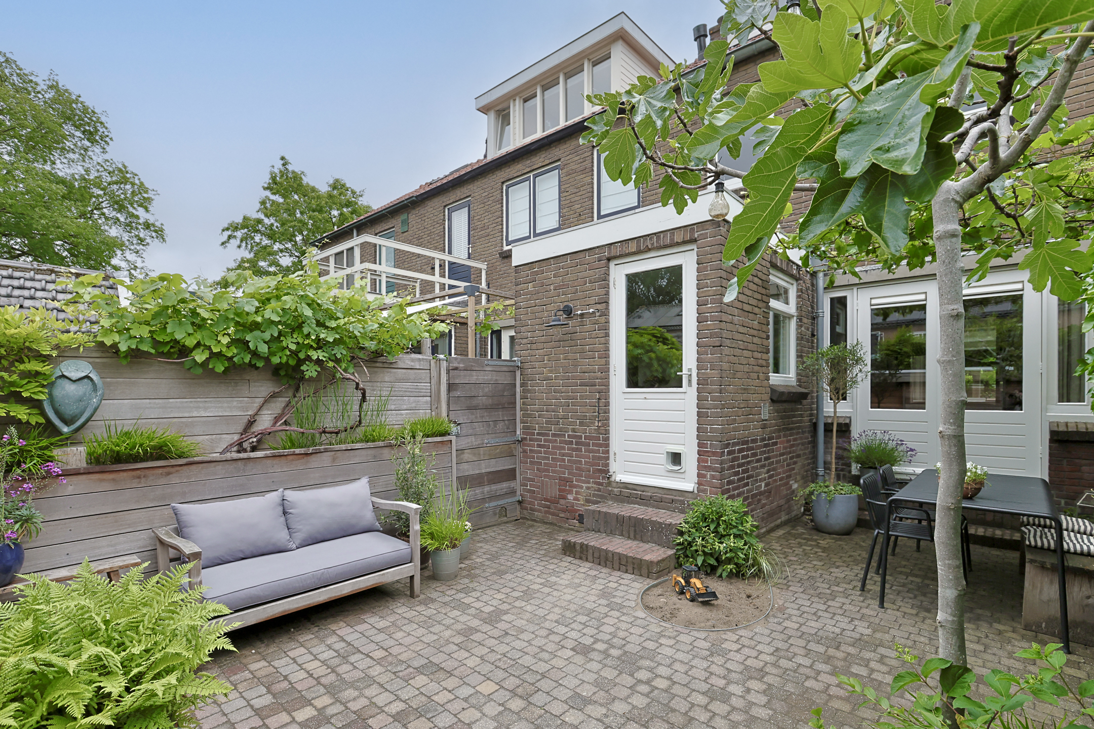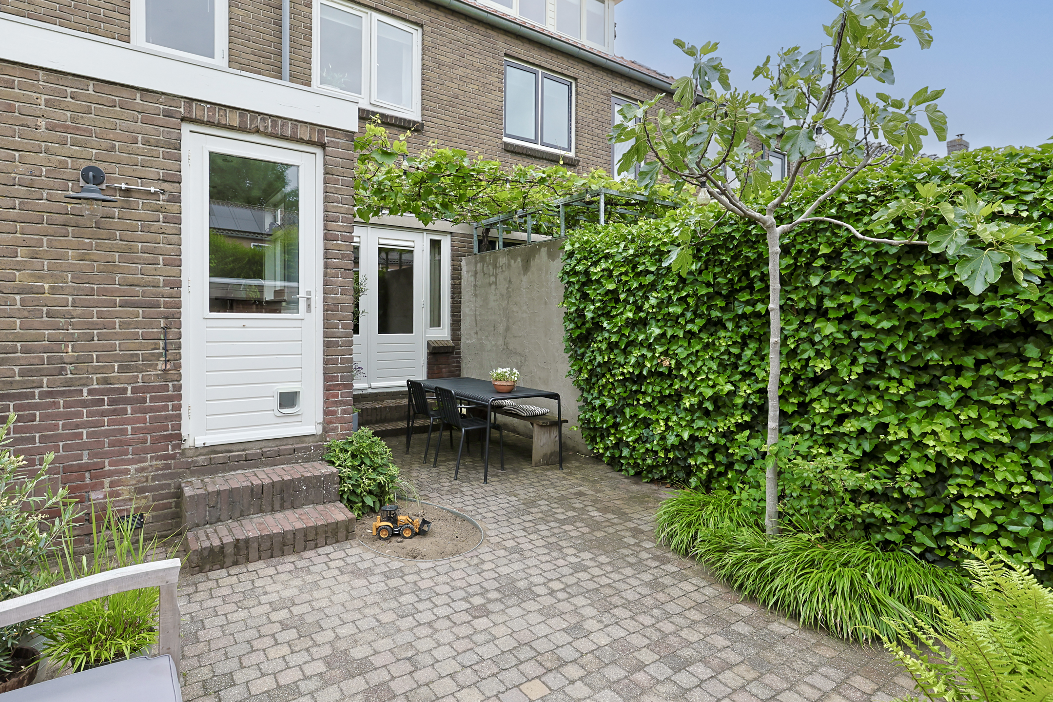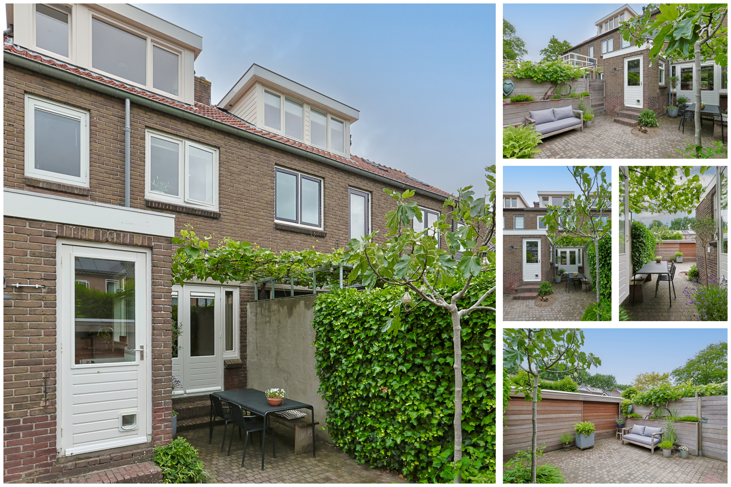 De achtertuin (op het westen) is een zonnige en groene stadstuin met meerdere zitplekken, een hardhouten berging (2021) voorzien van licht en elektra en een achterom direct naast het huis.