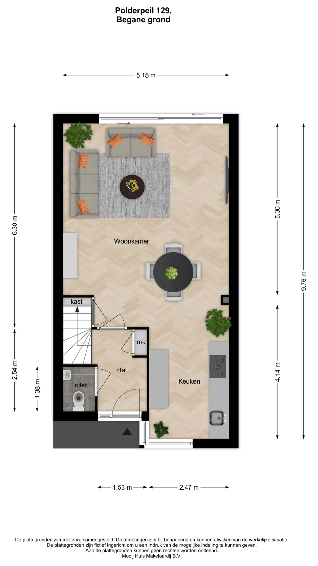 - De entree biedt toegang tot de toiletruimte, meterkast en trapopgang naar de eerste verdieping; daarnaast is er voldoende ruimte voor een garderobe.