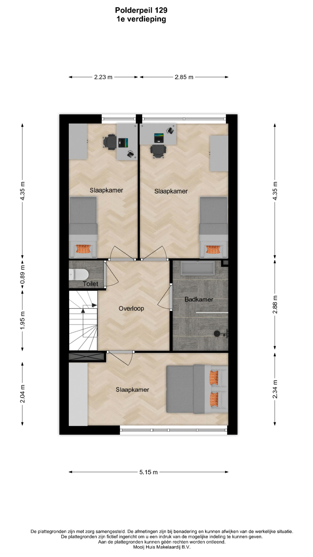 - De eerste verdieping biedt via de royale overloop toegang tot drie volwaardige slaapkamers, de badkamer, een separaat toilet en de trapopgang naar de tweede verdieping.