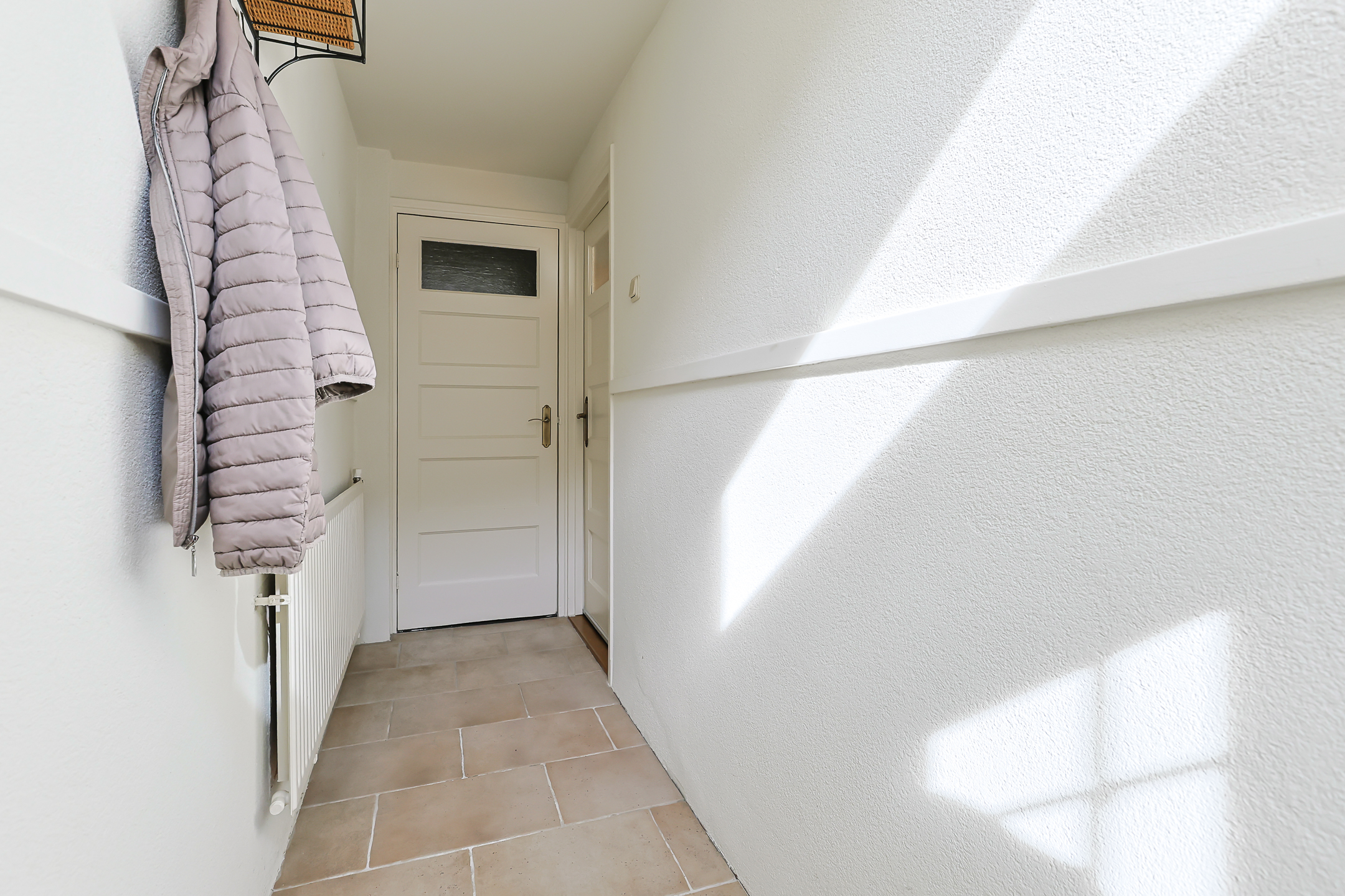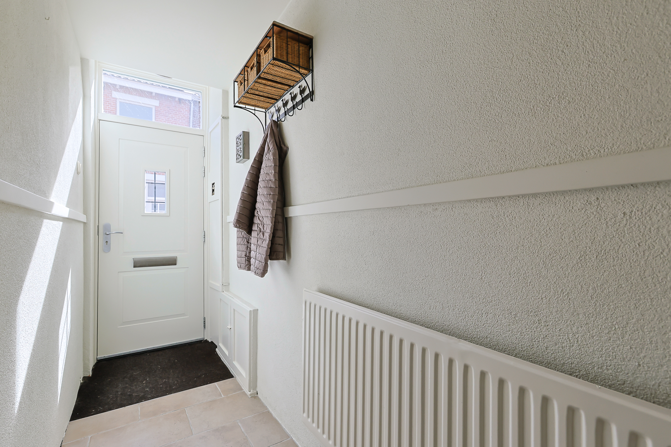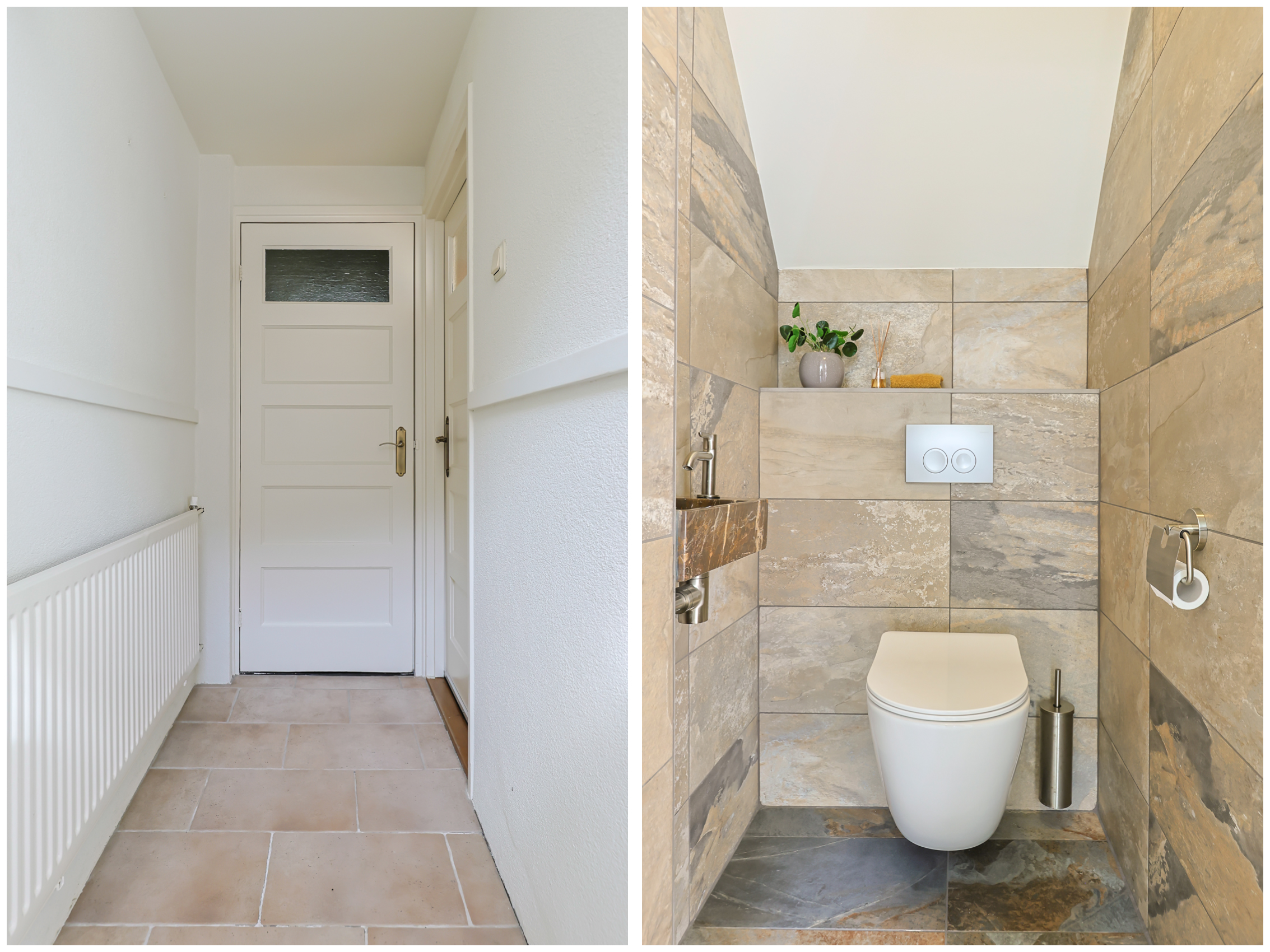 - Binnenkomst in de hal van de woning met meterkast direct naast voordeur, een moderne toiletruimte met fonteintje en deur naar woonkamer en keuken