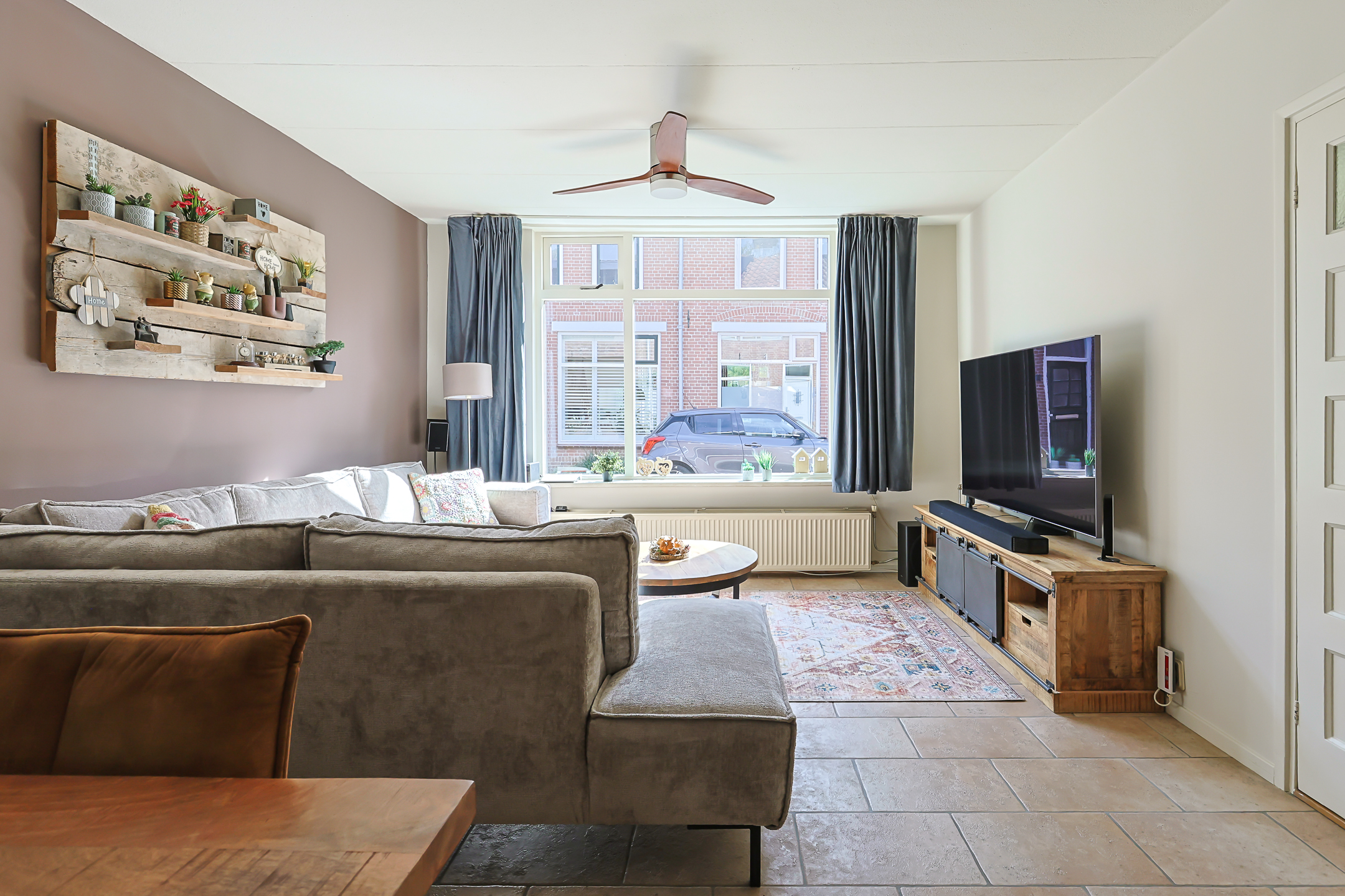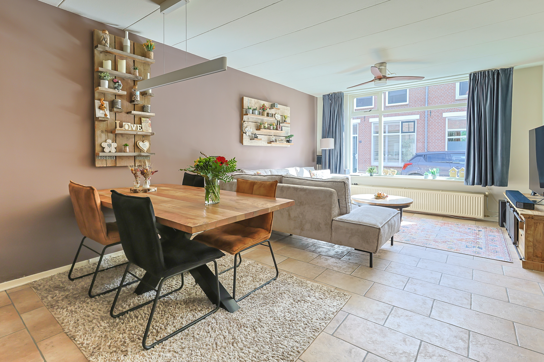 - De woonkamer voorzien van een strakke tegelvloer en grote raampartij. Er is voldoende ruimte aanwezig voor ruime zithoek en eethoek