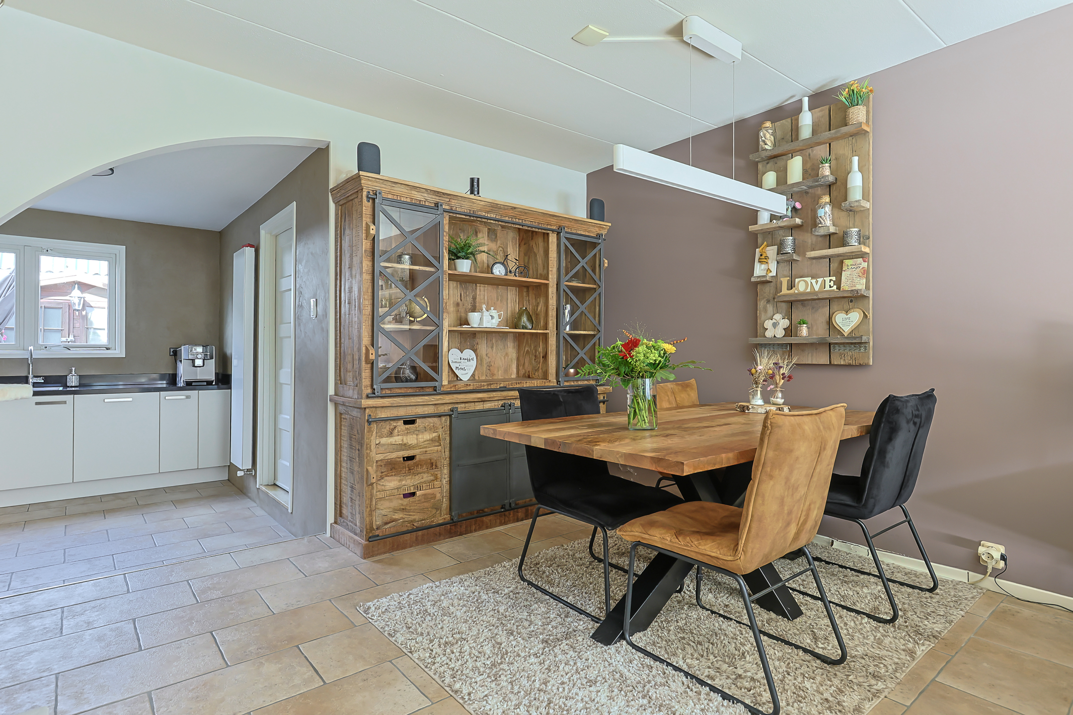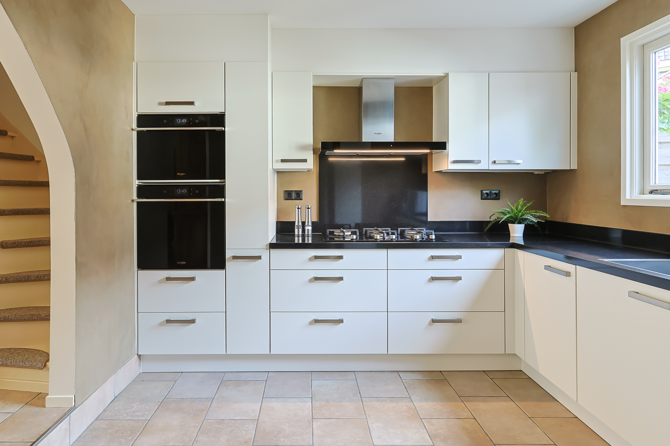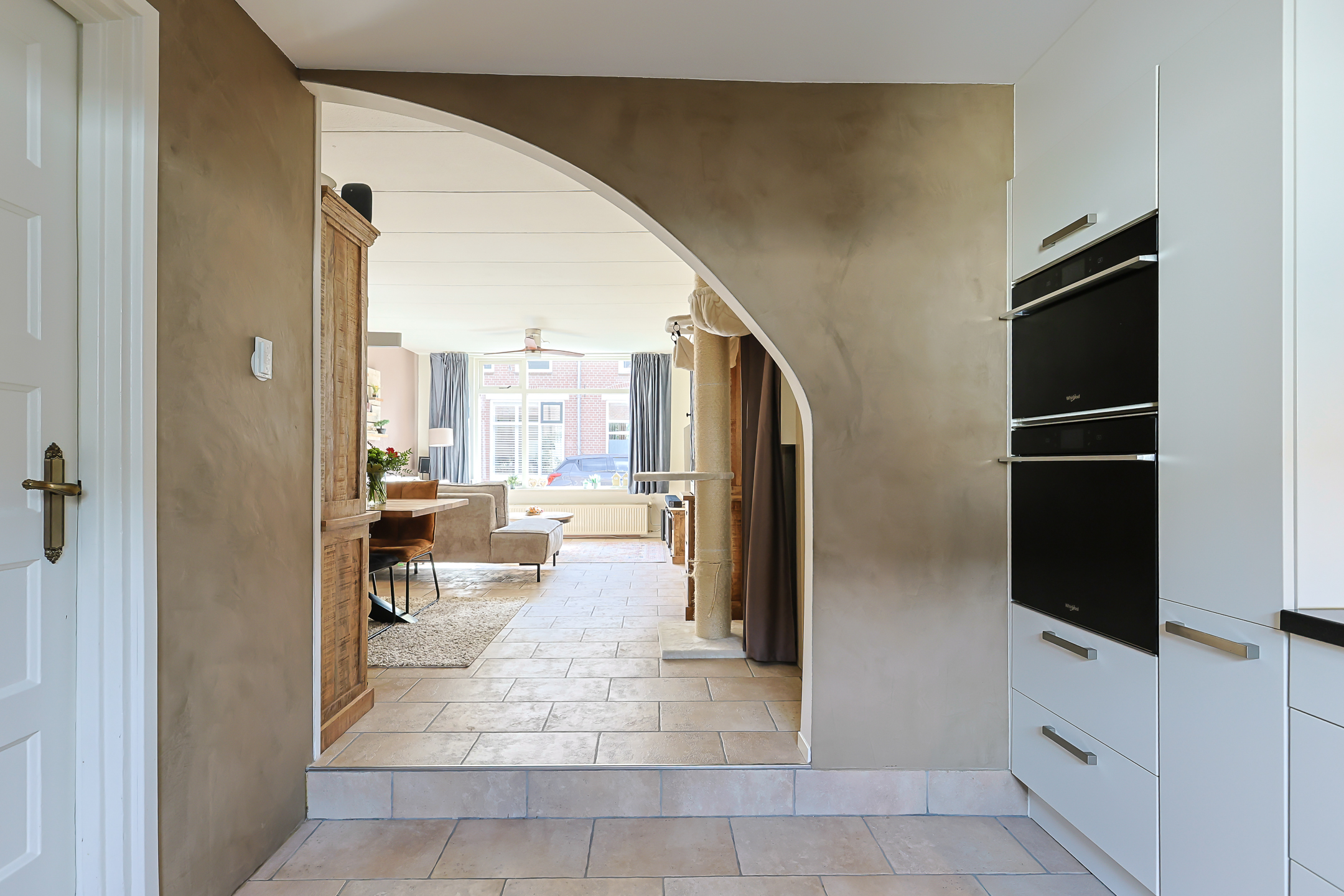 - Via een speelse doorgang kom je terecht in de open keuken, met deur naar de bijkeuken