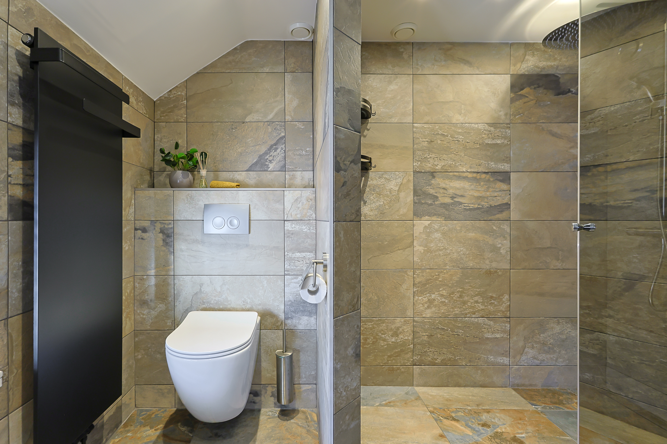 - De moderne badkamer (2022) is strak afgewerkte met grote tegels, zowel natuurlijke- als mechanische ventilatie, een ruime wastafel én een inloopdouche met regendouche. Ook is er een praktische radiator aanwezig