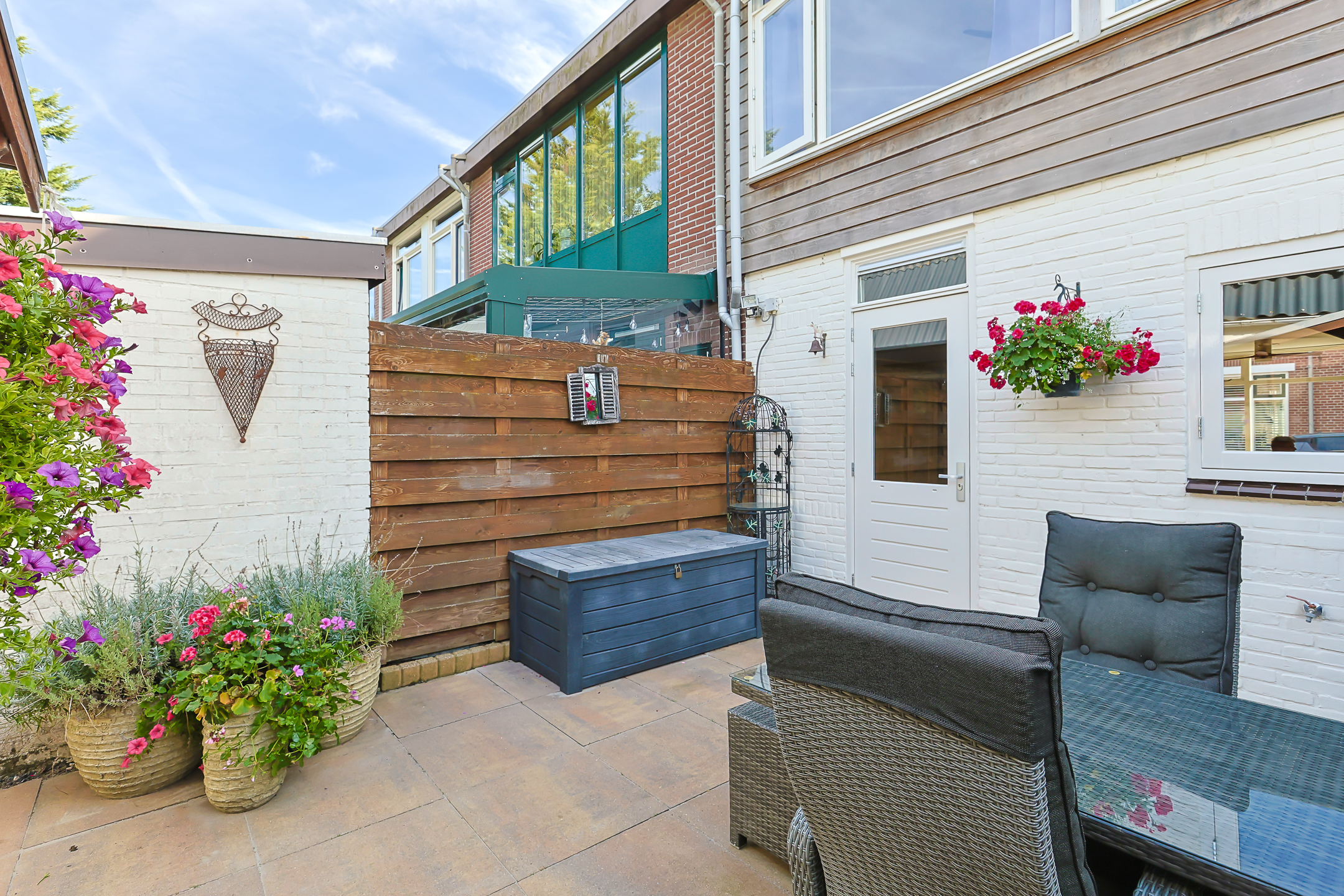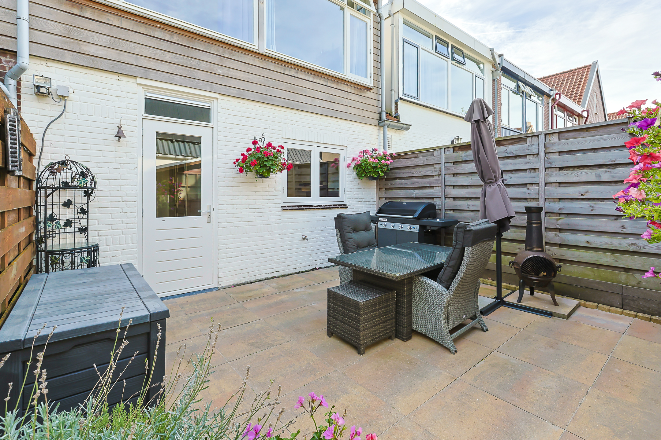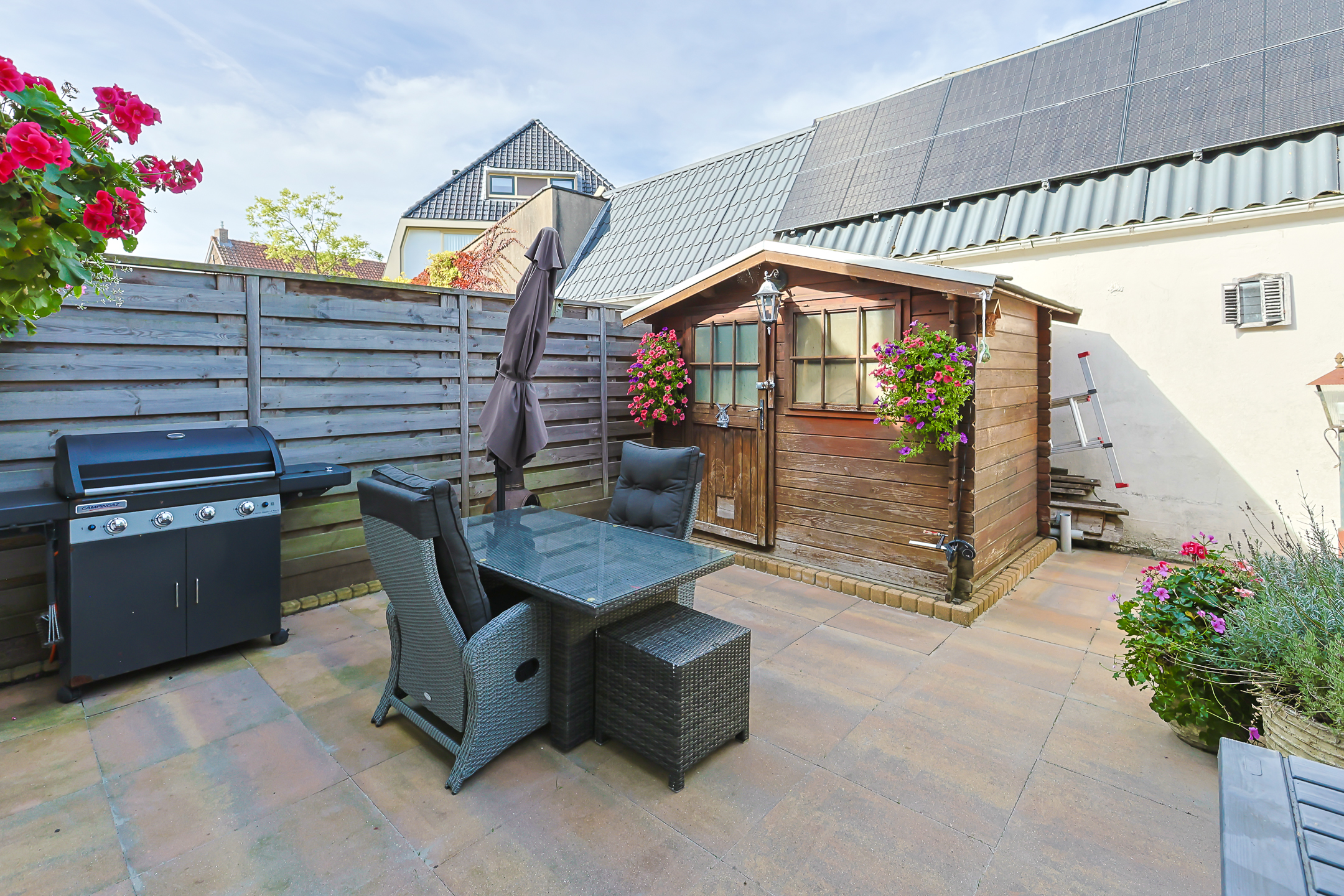 - De achtertuin van de woning is gelegen op het noordwesten en is onderhoudsvrij betegeld. Door de ligging beschikt de tuin de gehele dag over zowel zon als schaduw
