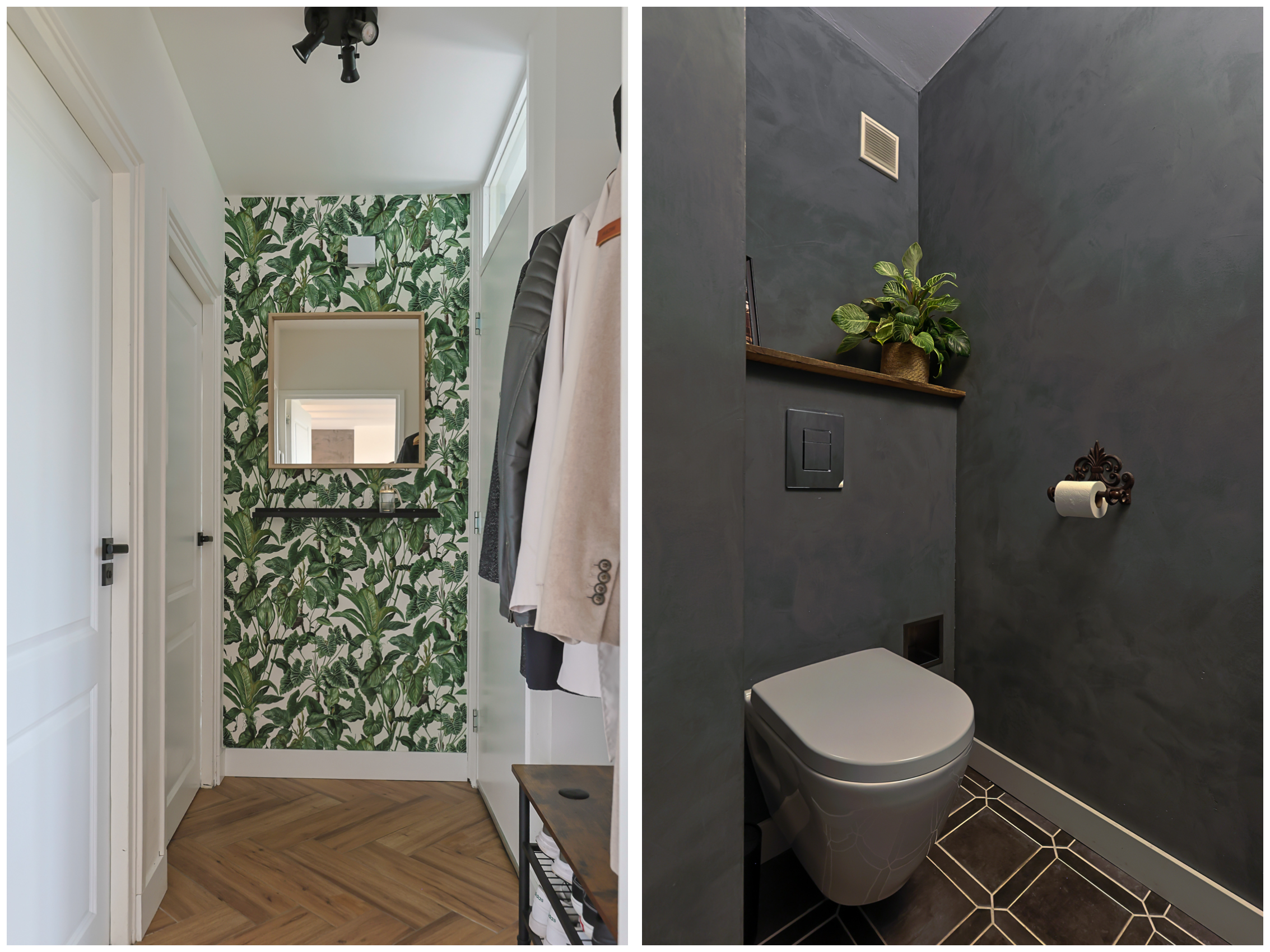 - De toiletruimte is voorzien van een wandtoilet en moderne afwerking. De muren zijn volledig voorzien van beton ciré en op de vloer is een modern tegelpatroon te vinden