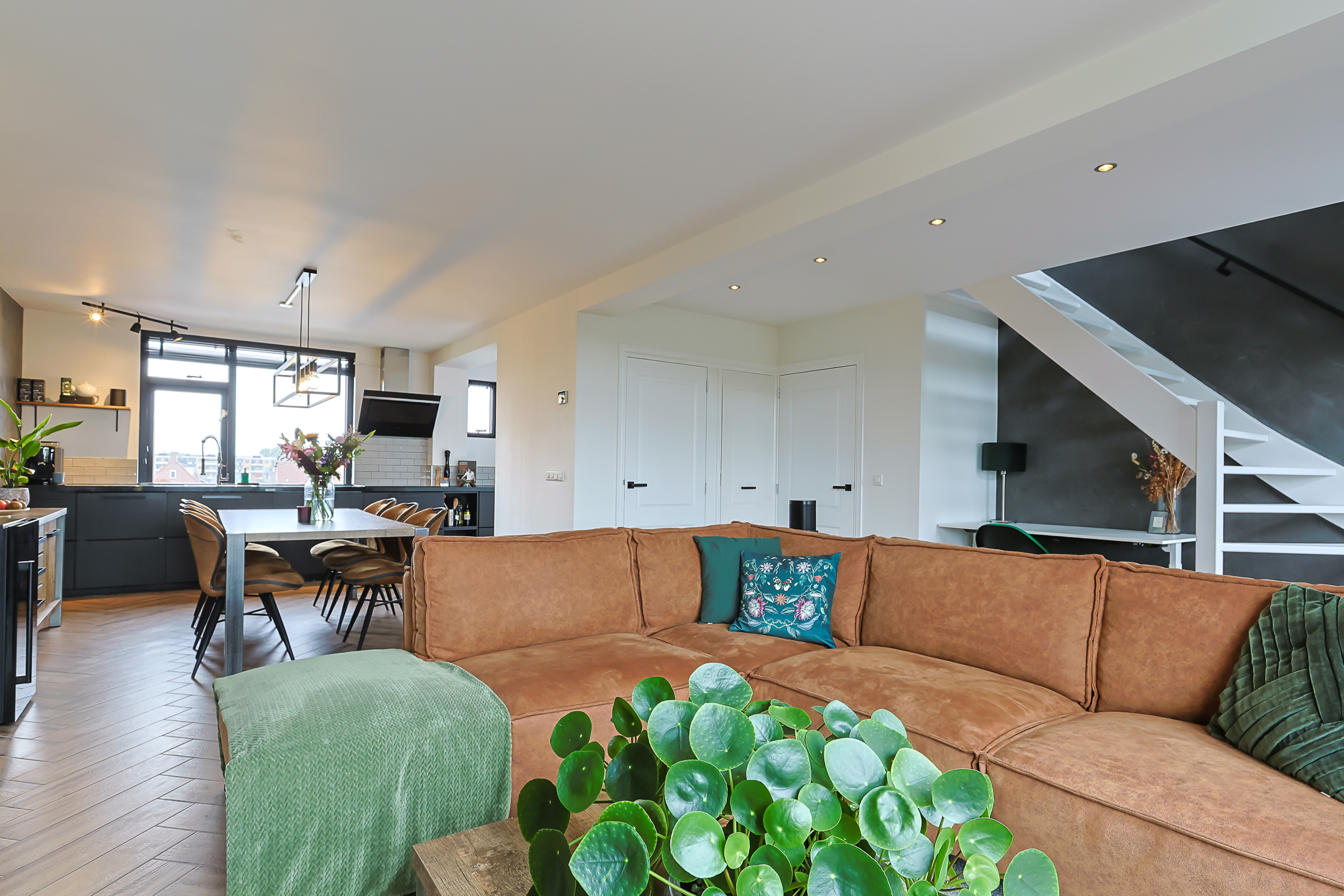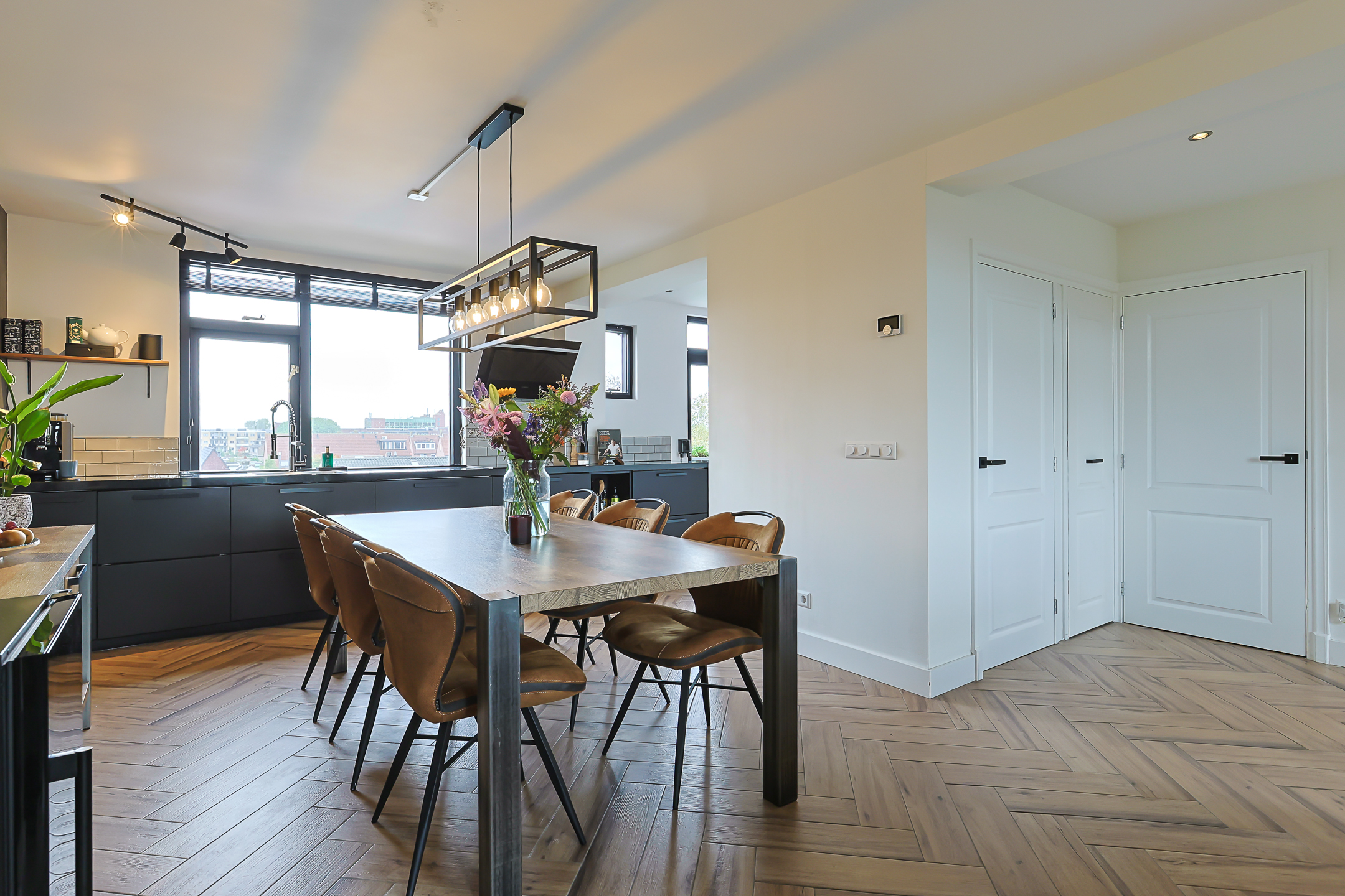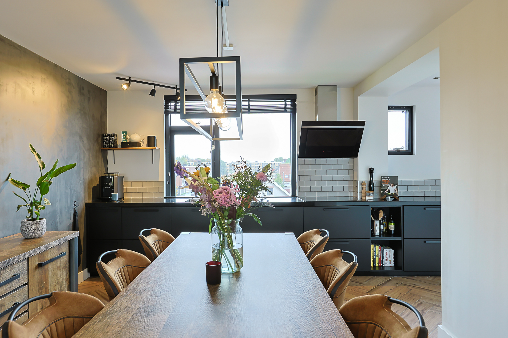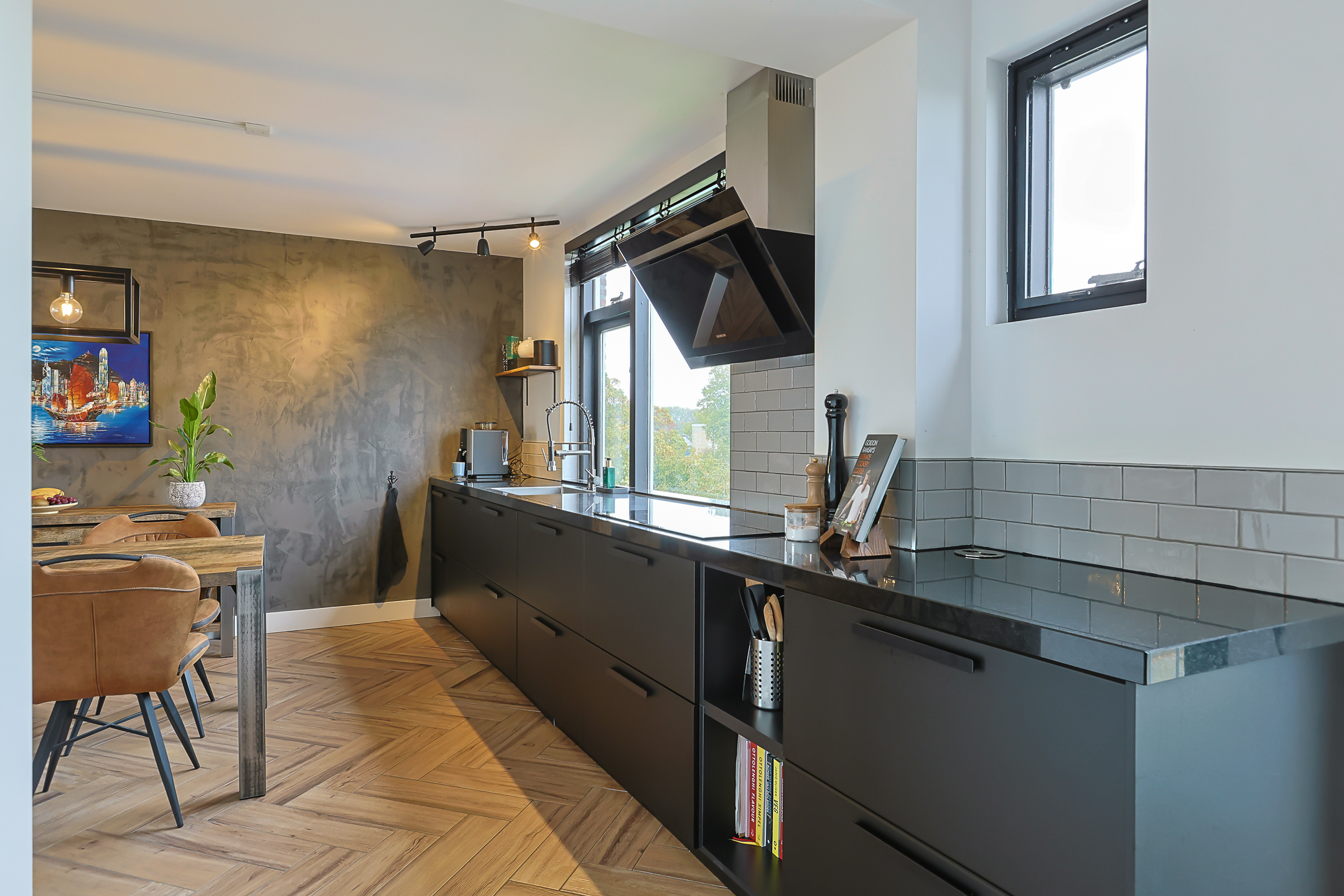- Aan de andere zijde van de woning is de moderne open keuken te vinden. De keuken is in 2019 volledig vernieuwd en voorzien van moderne inbouwapparatuur, zoals een inductiekookplaat, koel-vriescombinatie, recirculatiekap, vaatwasser, oven en magnetron. De keuken is voorzien van matzwarte frontjes en een composiet werkblad