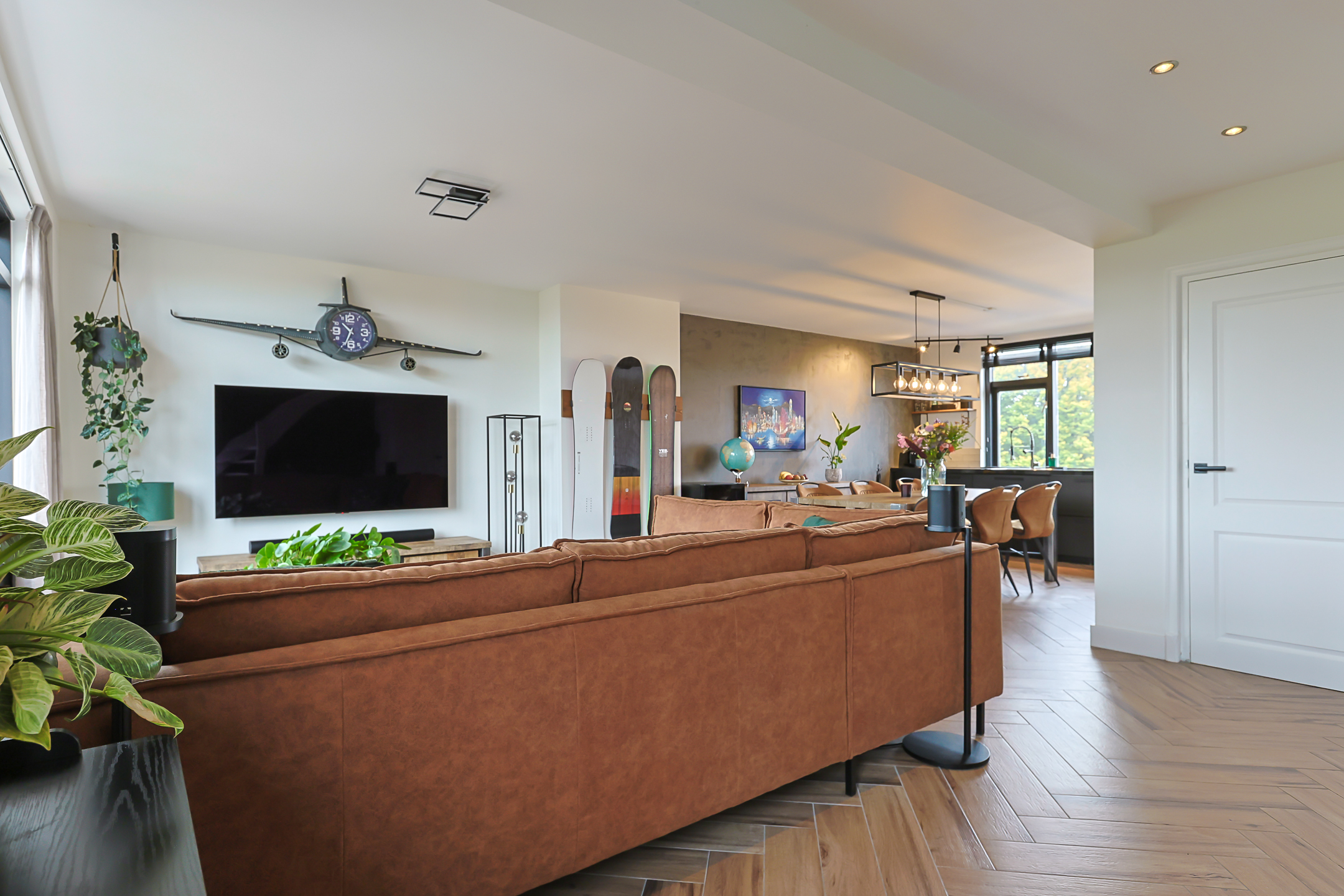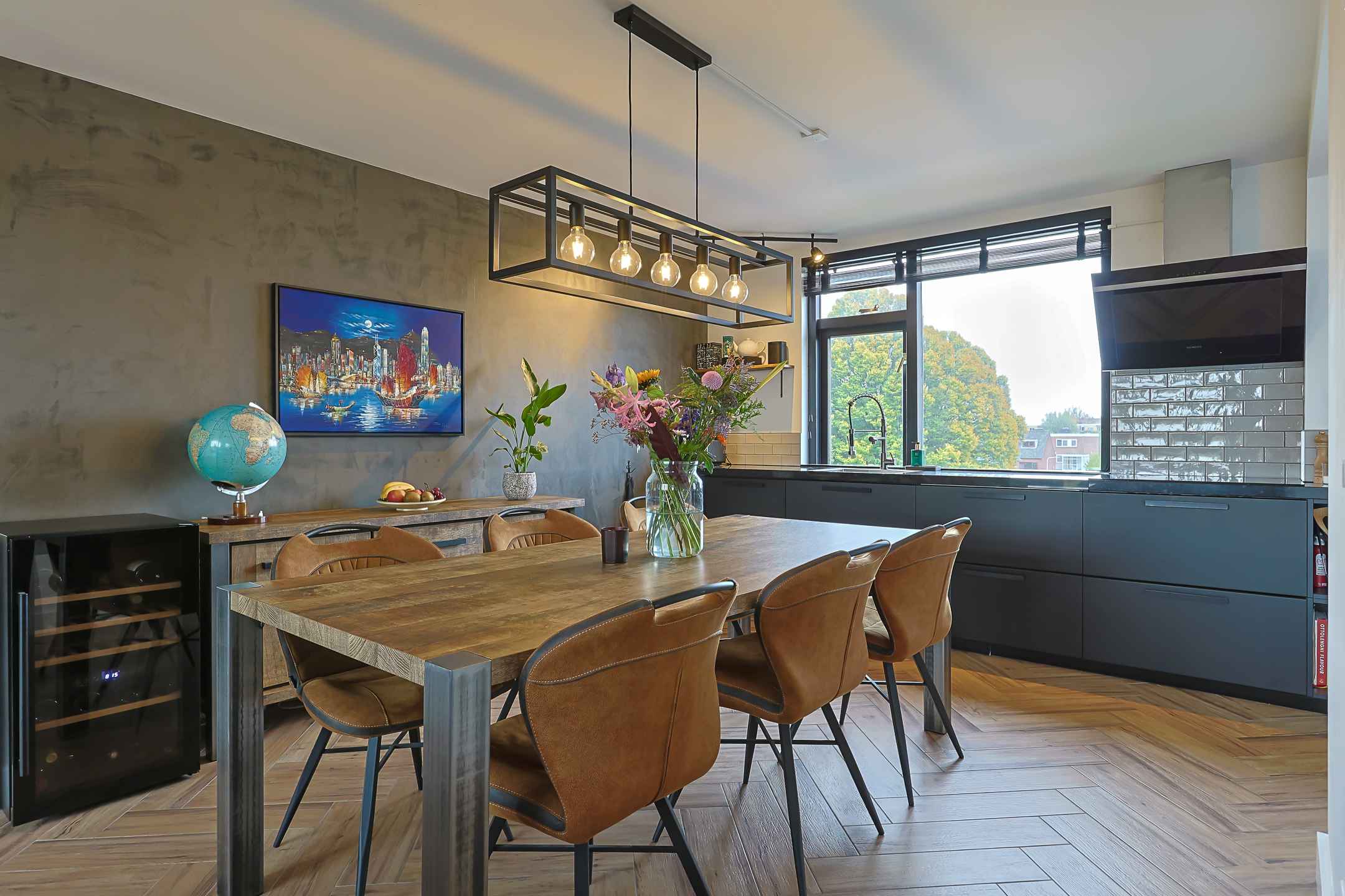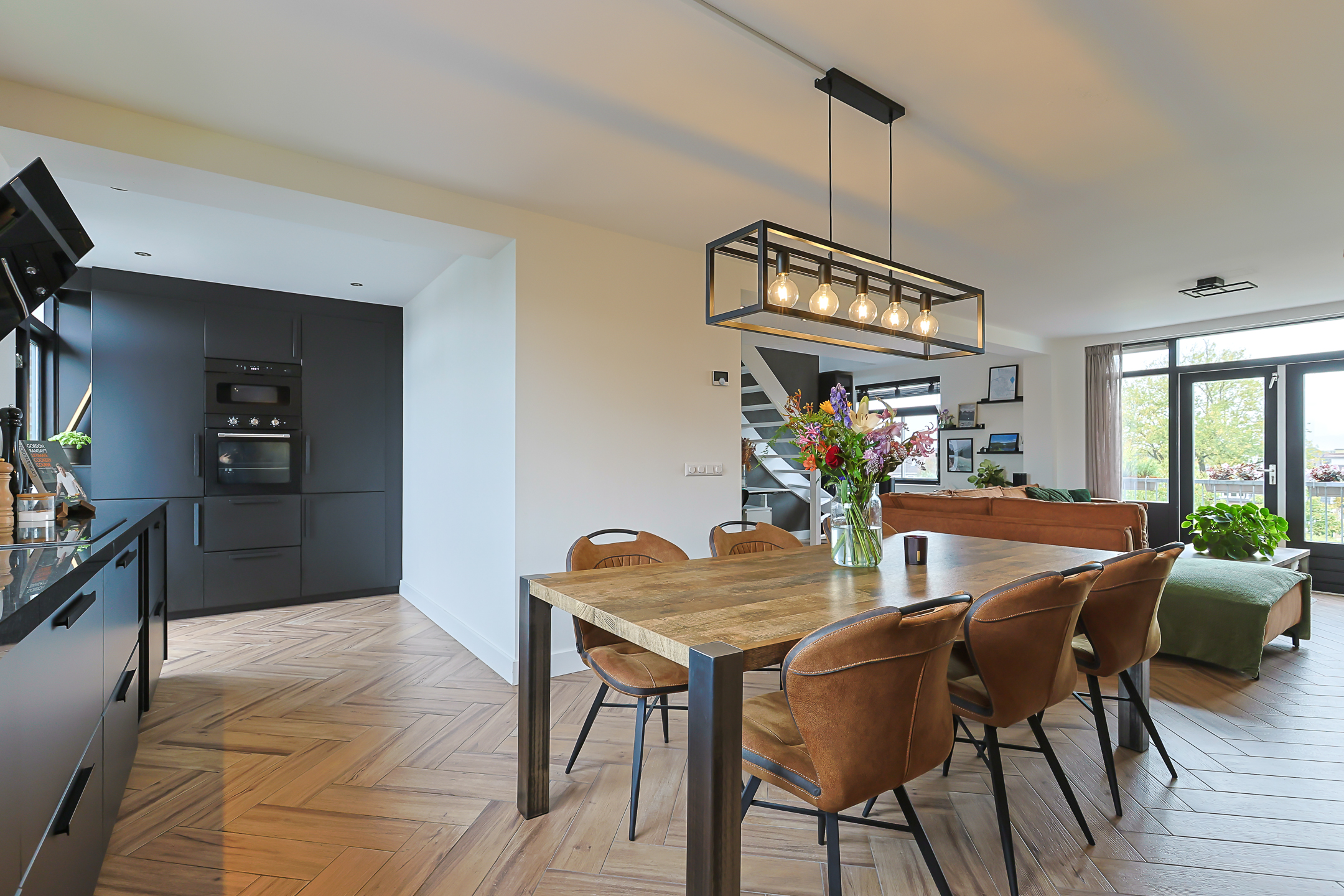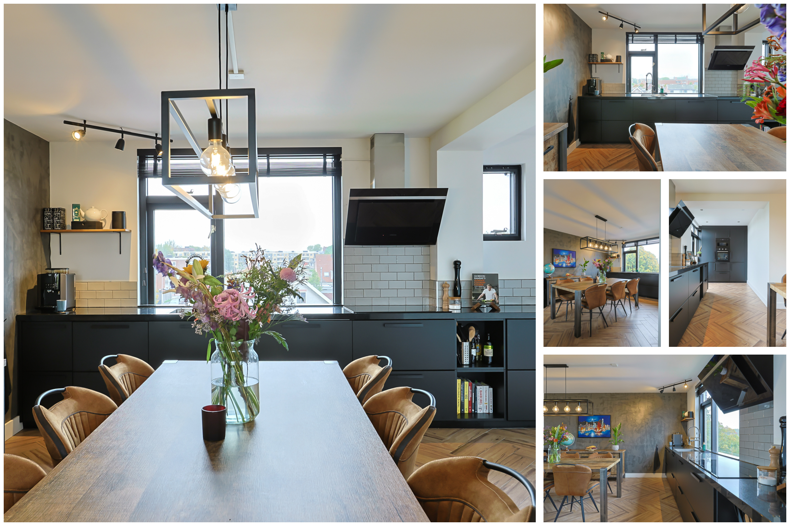 - Aan de andere zijde van de woning is de moderne open keuken te vinden. De keuken is in 2019 volledig vernieuwd en voorzien van moderne inbouwapparatuur, zoals een inductiekookplaat, koel-vriescombinatie, recirculatiekap, vaatwasser, oven en magnetron. De keuken is voorzien van matzwarte frontjes en een composiet werkblad