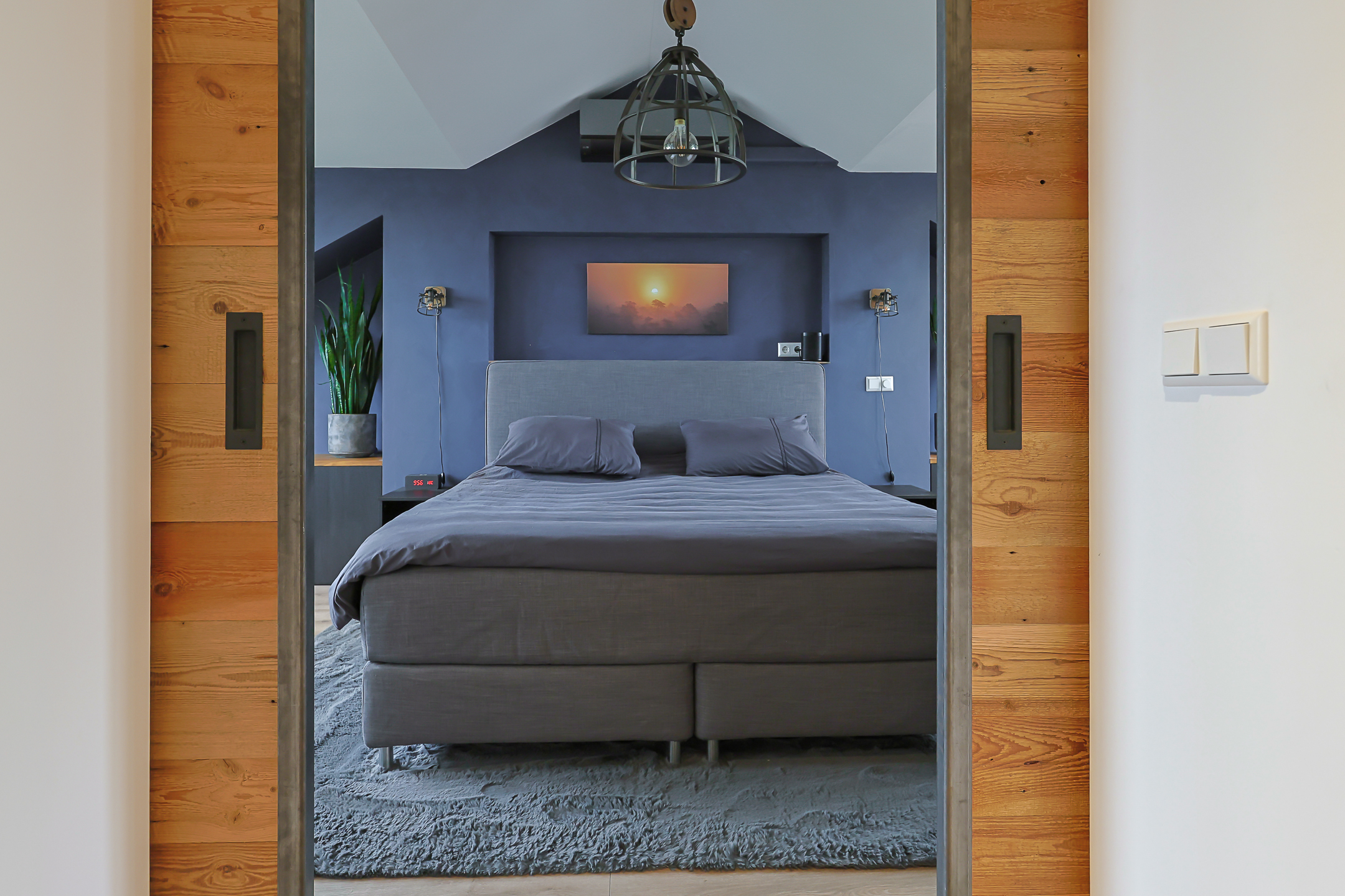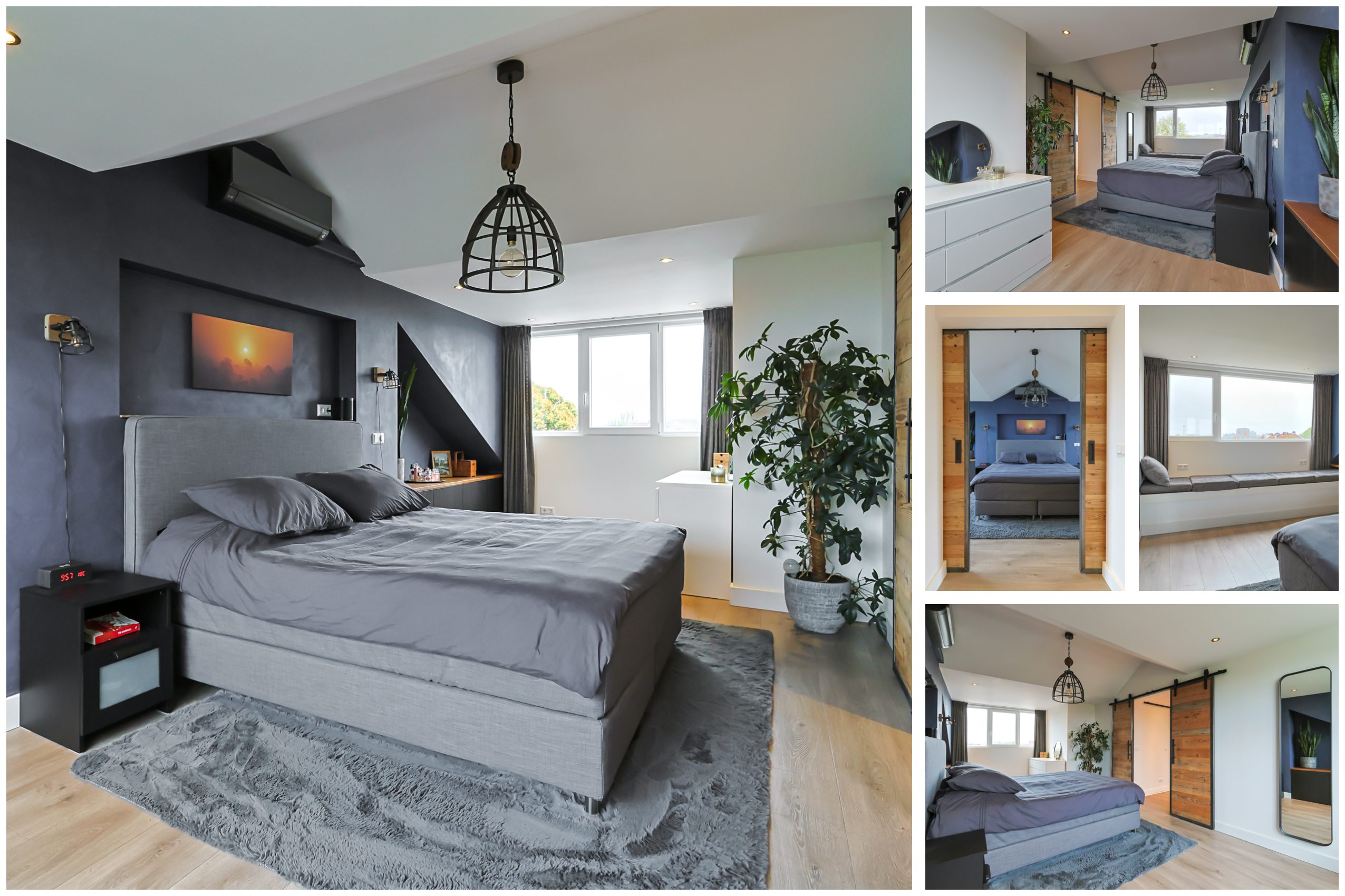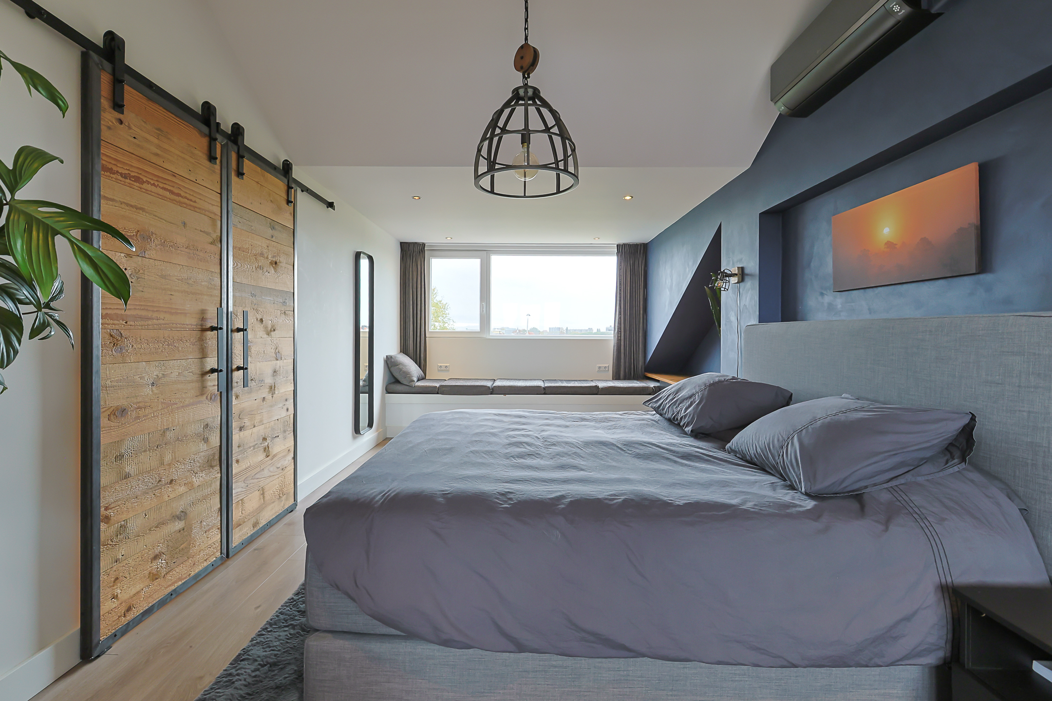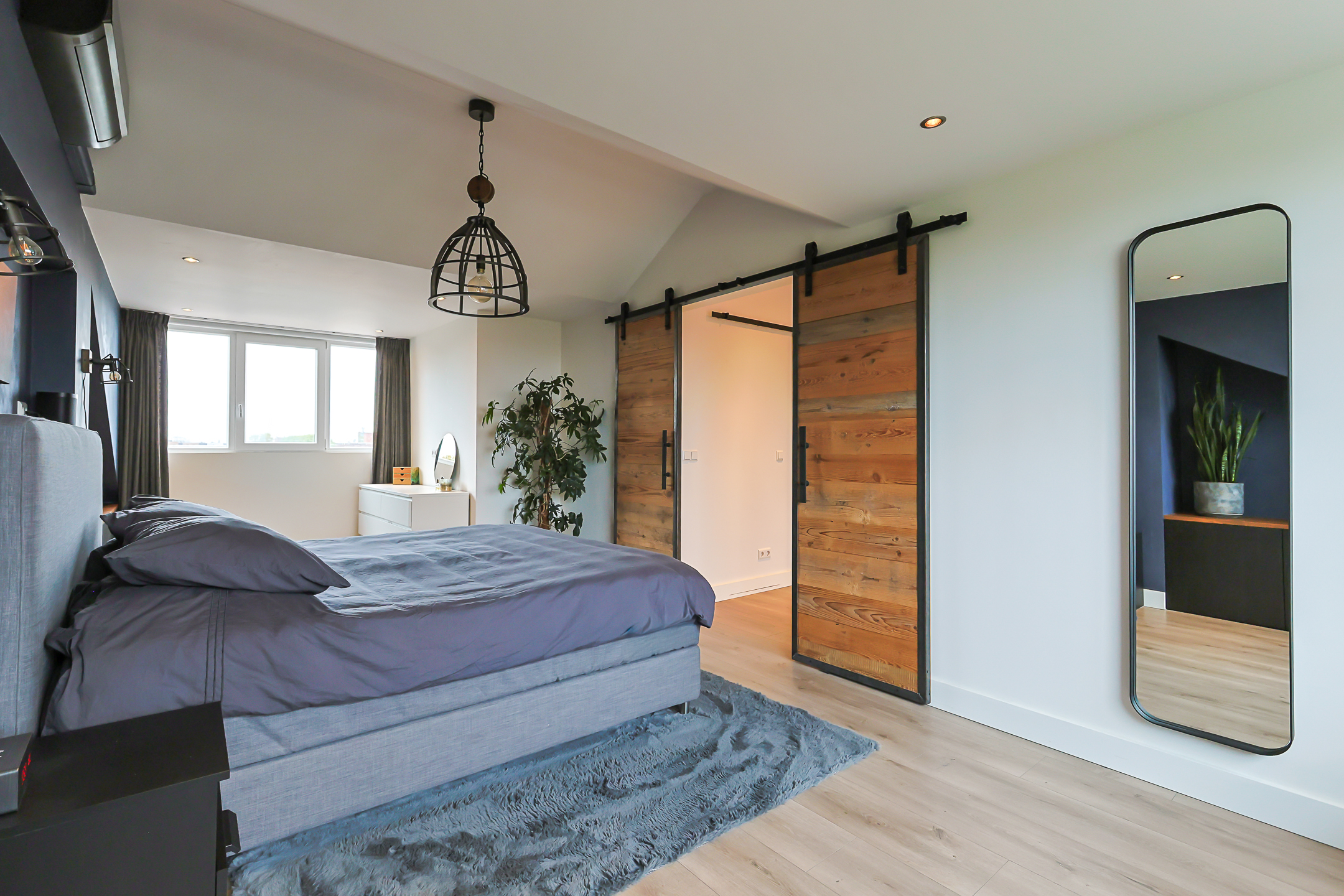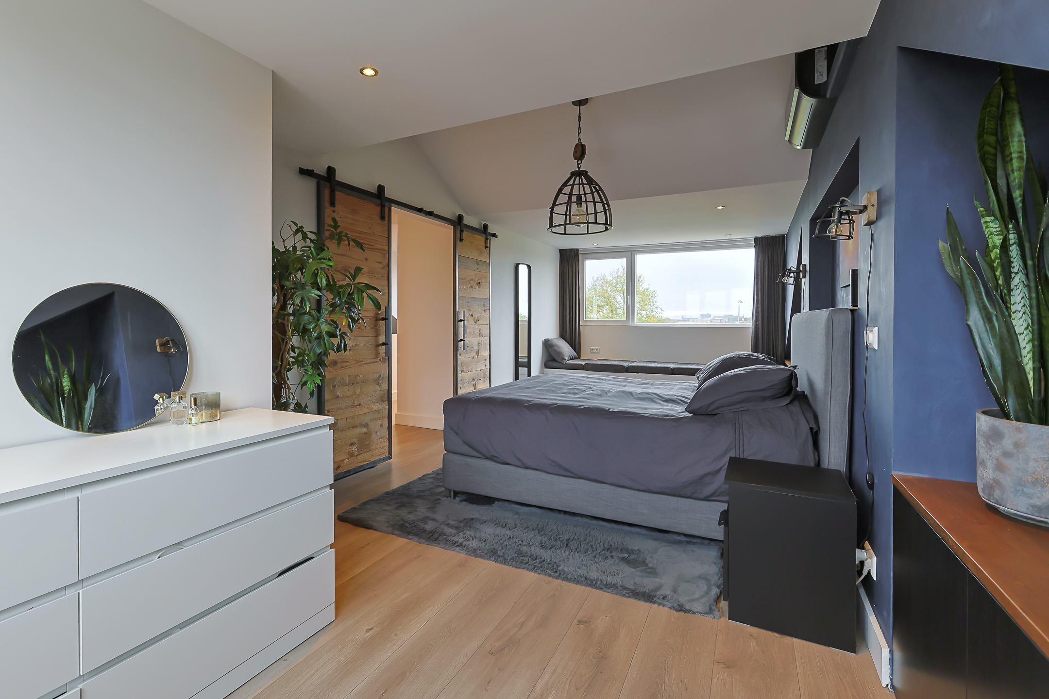 - De master bedroom is vanaf de overloop toegankelijk middels de rustieke houten schuifdeuren. De slaapkamer is heerlijk ruim opgezet en biedt alle ruimte voor een comfortabele inrichting. Er is hier ook airco aanwezig en de dakkapellen zijn voorzien van inbouwspots en een heerlijk zitje!