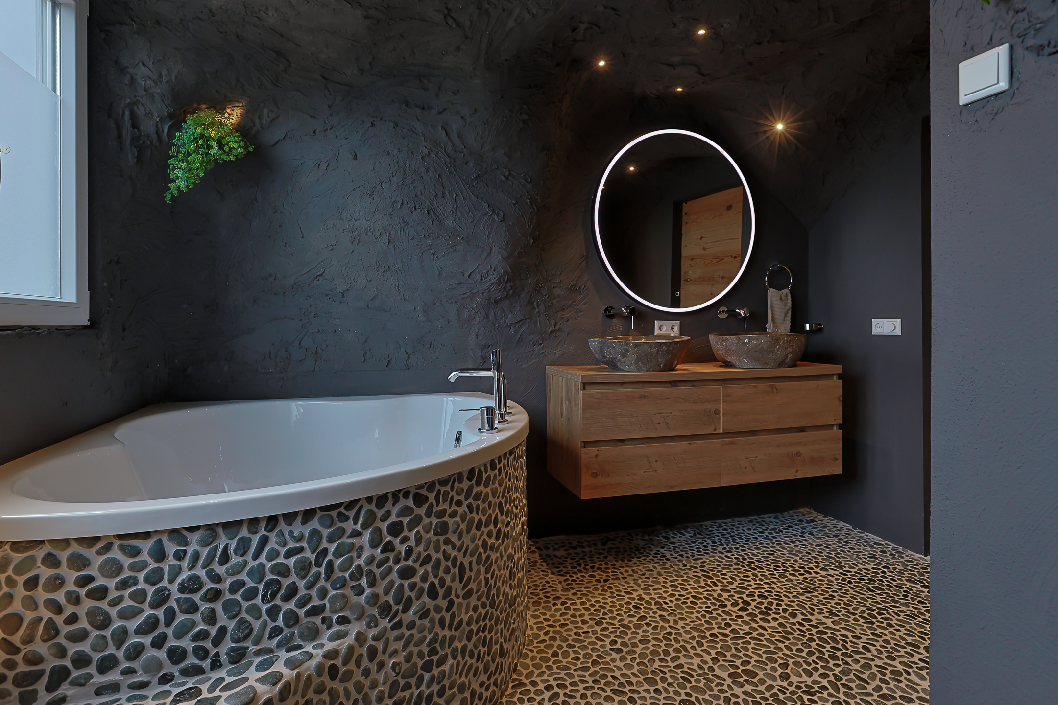 - Luxe badkamer met hoekbad, dubbele wastafel op meubel en inloopdouche