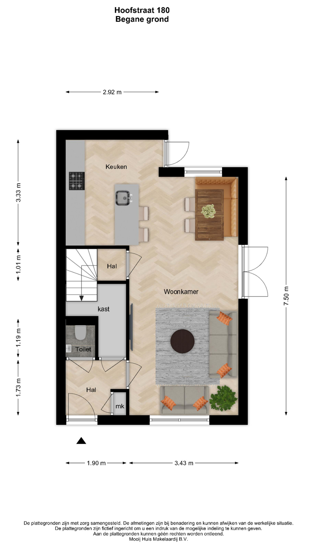 - De woonkamer beschikt over voldoende ruimte voor een gezellige zithoek met hoekbank en een ruime eettafel