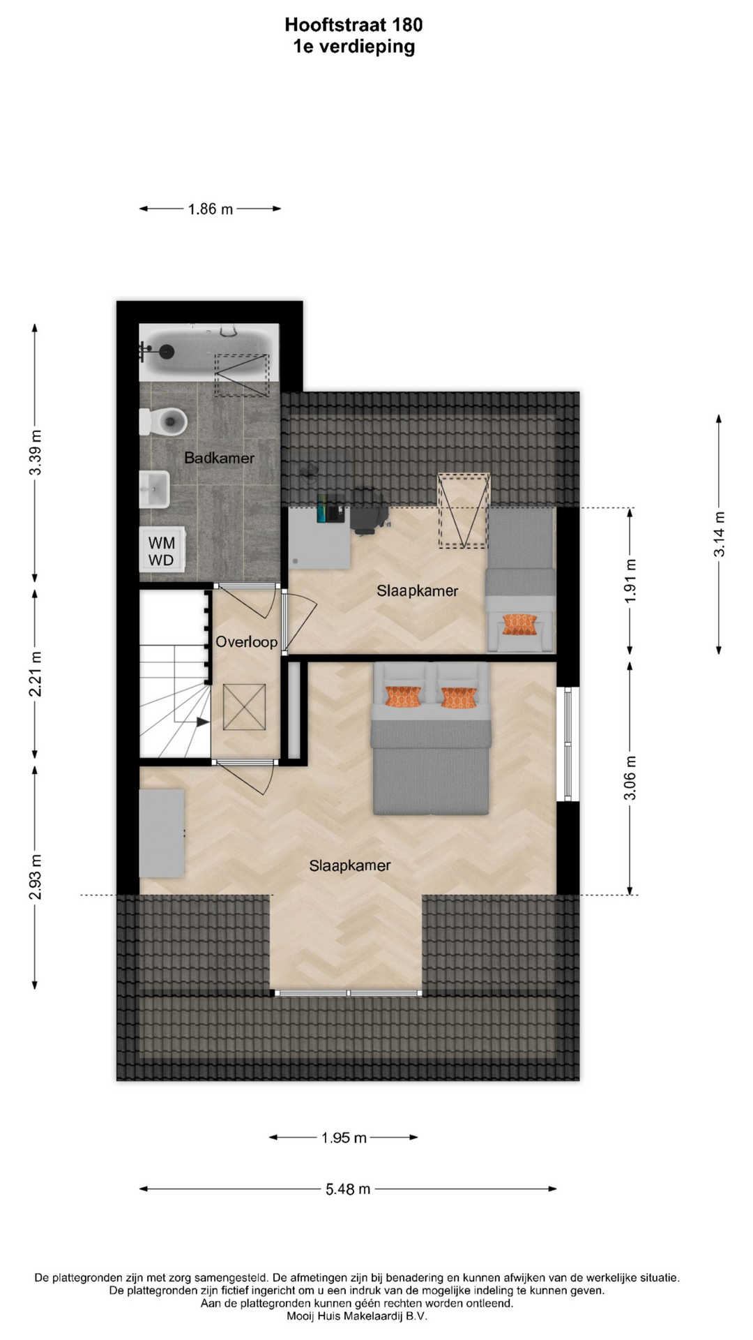 - De master bedroom is gelegen aan de voorzijde van de woning. Dankzij de dakkapel is hier extra ruimte gecreëerd en beschikt de kamer over veel lichtinval. De ruimte is afgewerkt met vloerbedekking