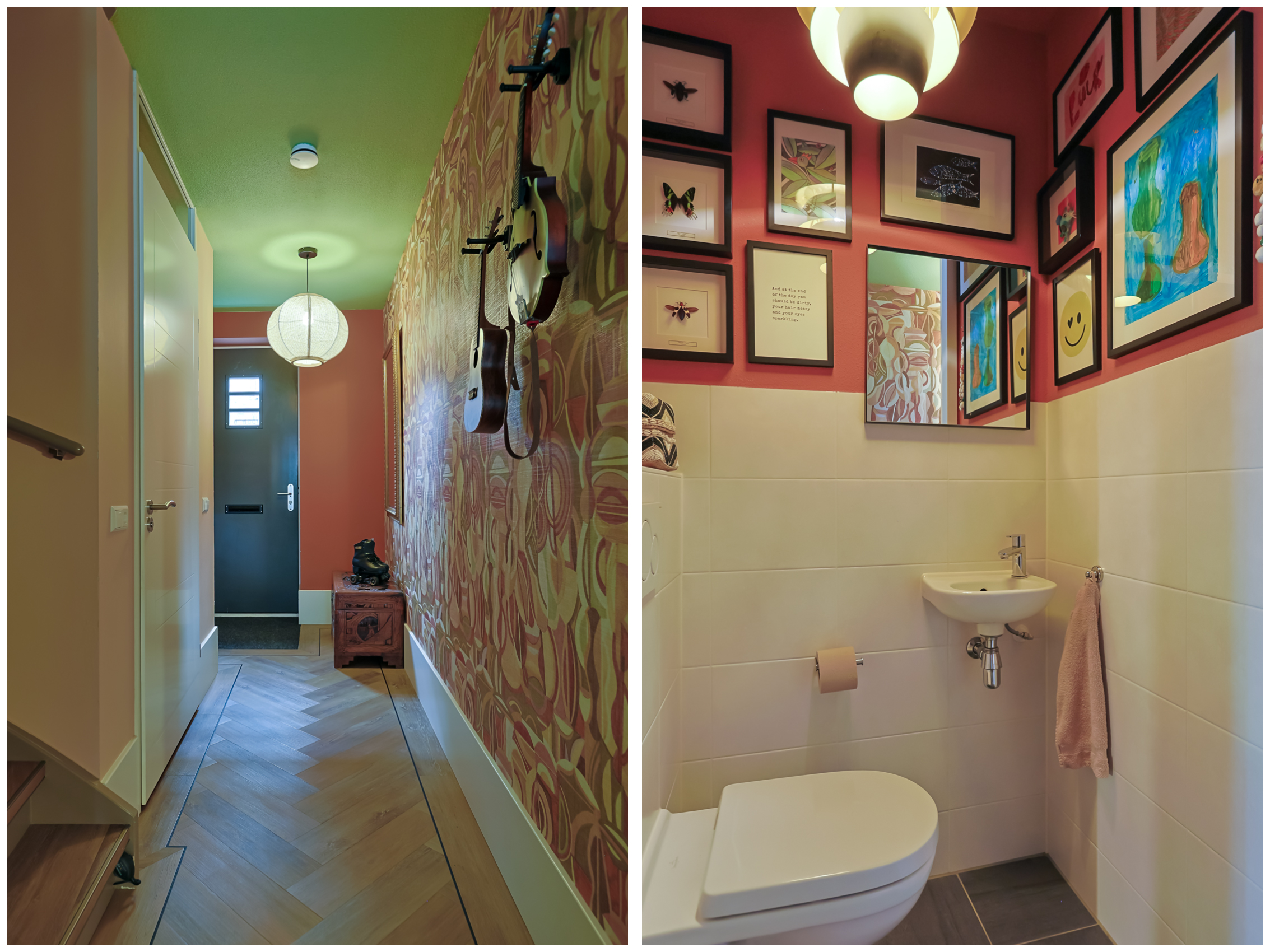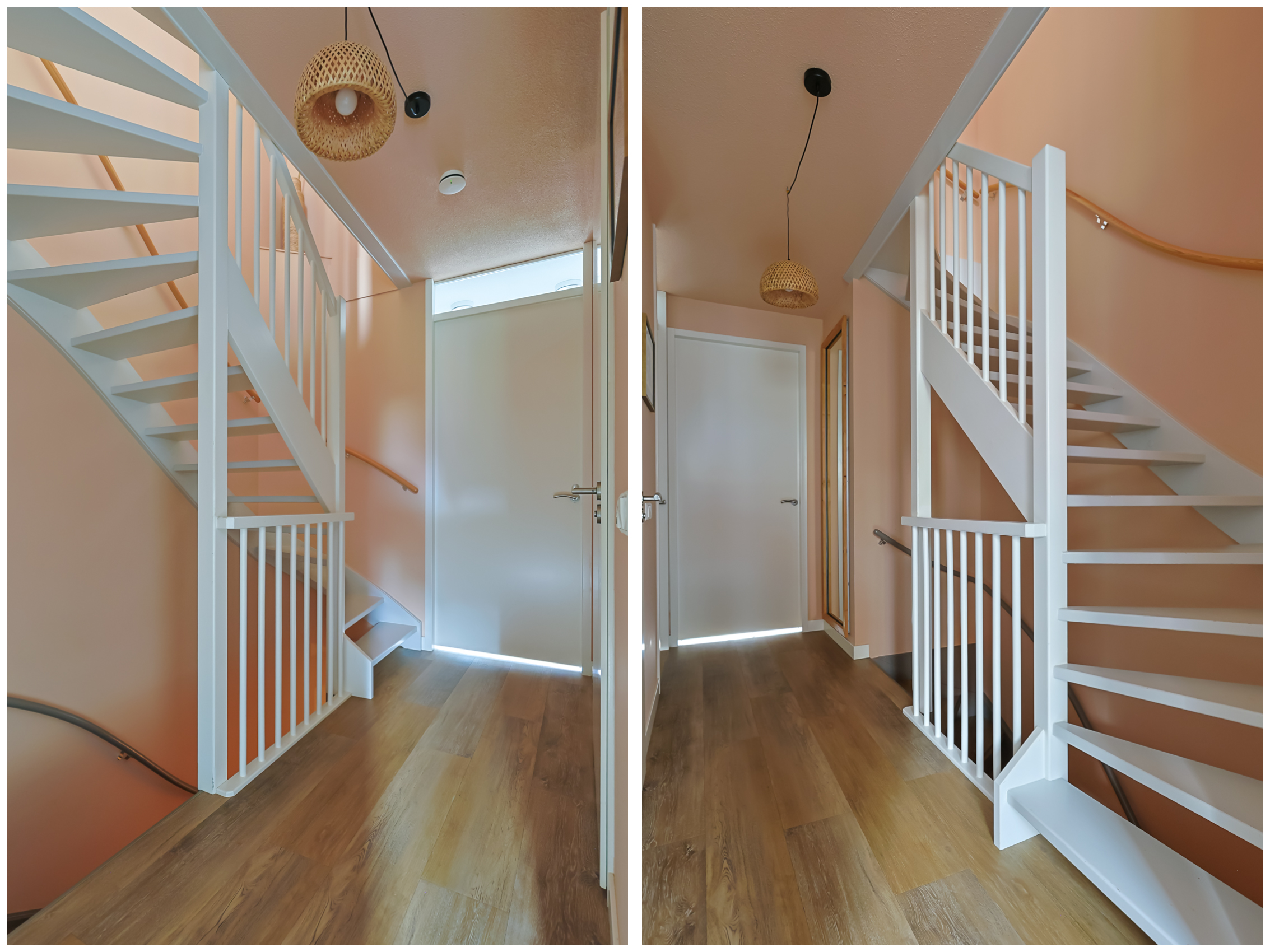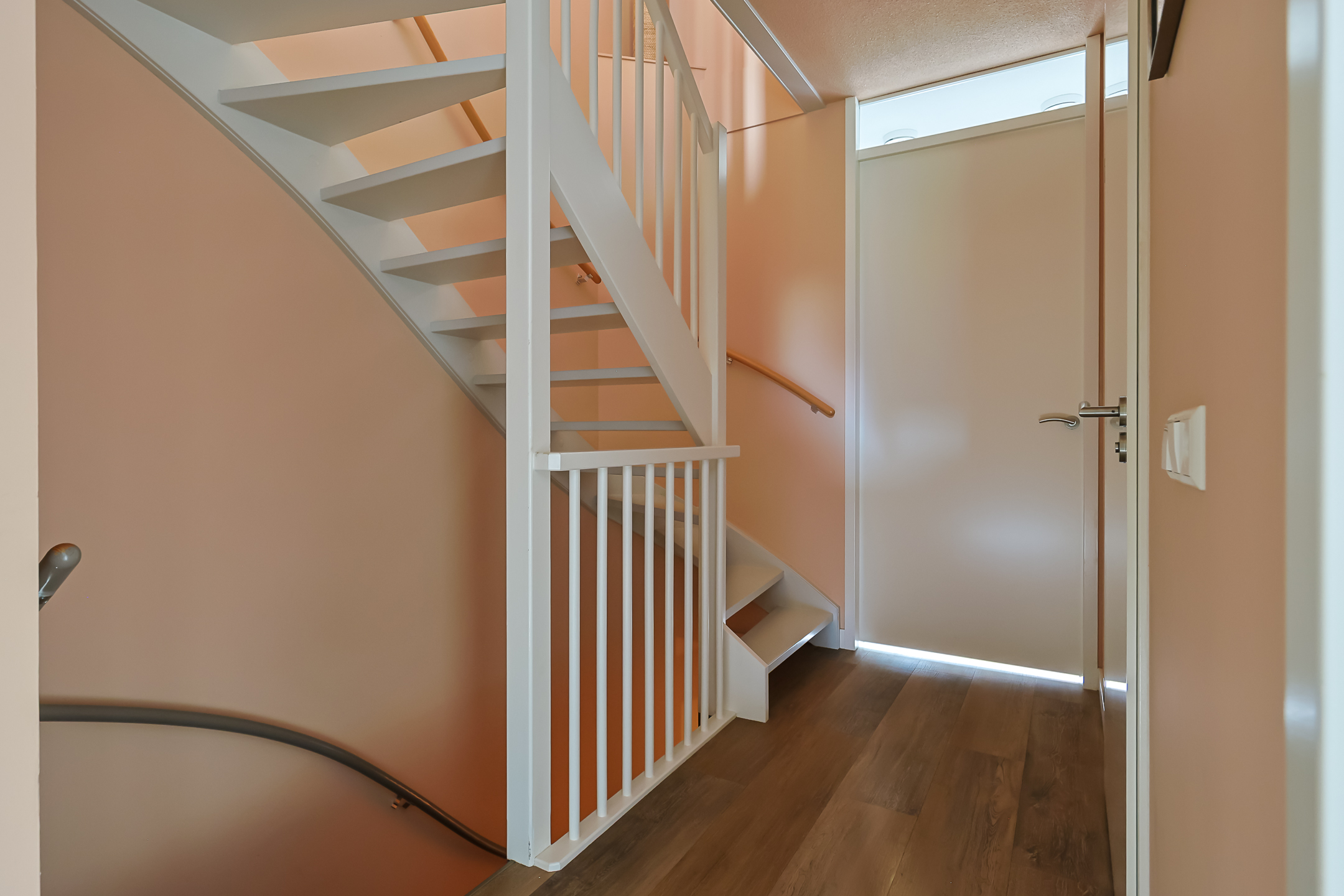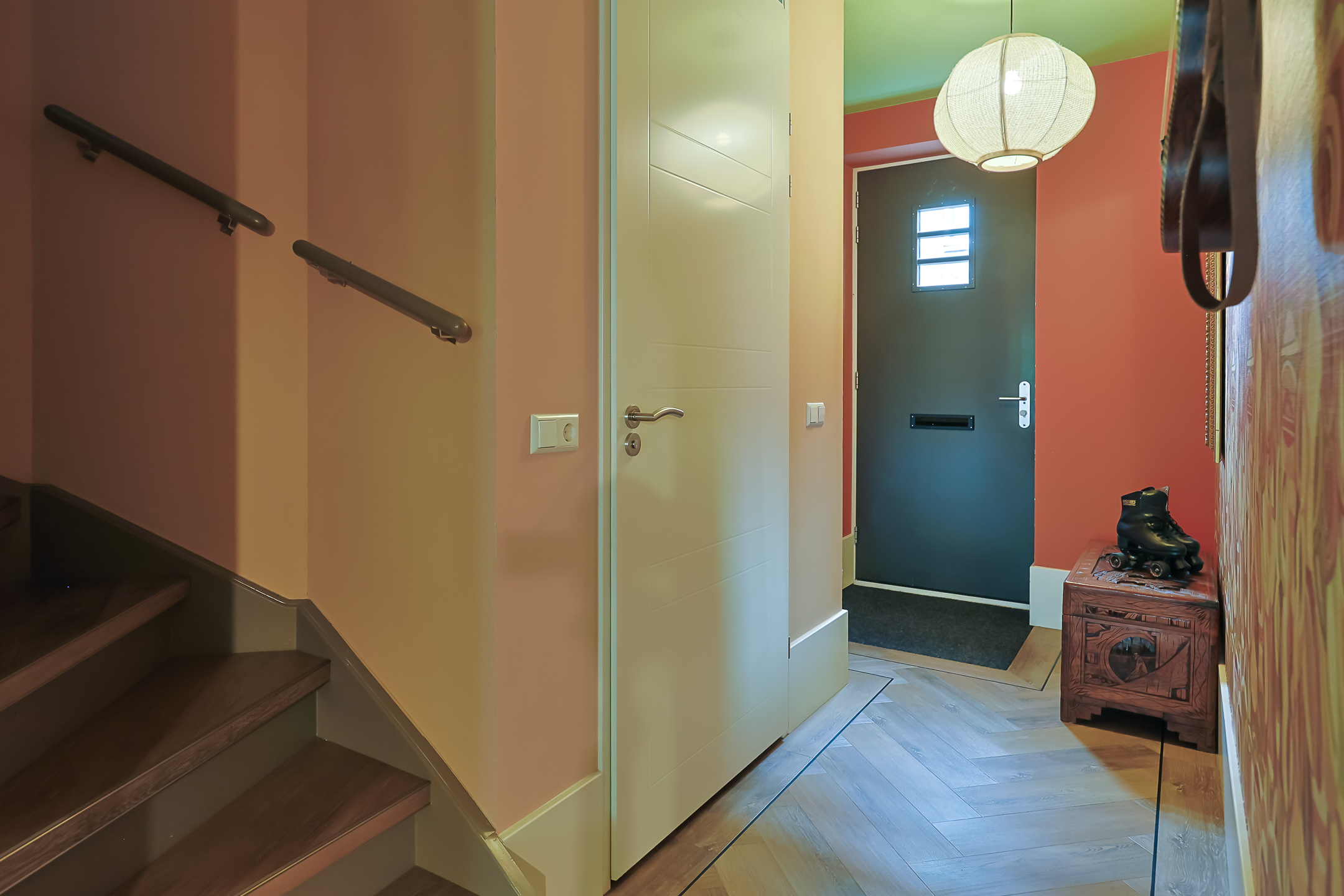 - De entree van de woning is ruim en beschikt over de meterkast, toiletruimte, trapopgang naar de eerste verdieping met sfeervolle verlichting onder de traptreden en ruimte voor de garderobe