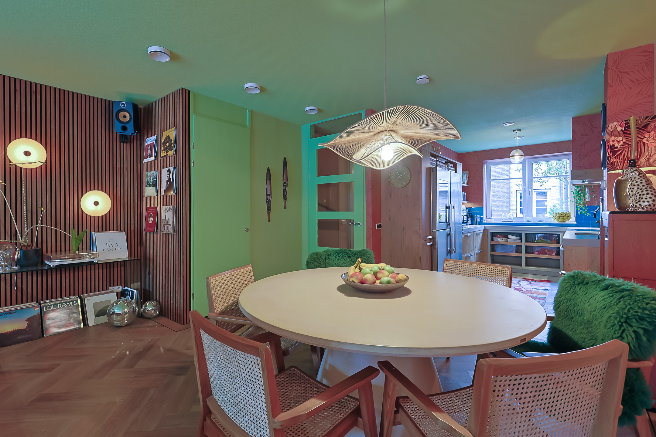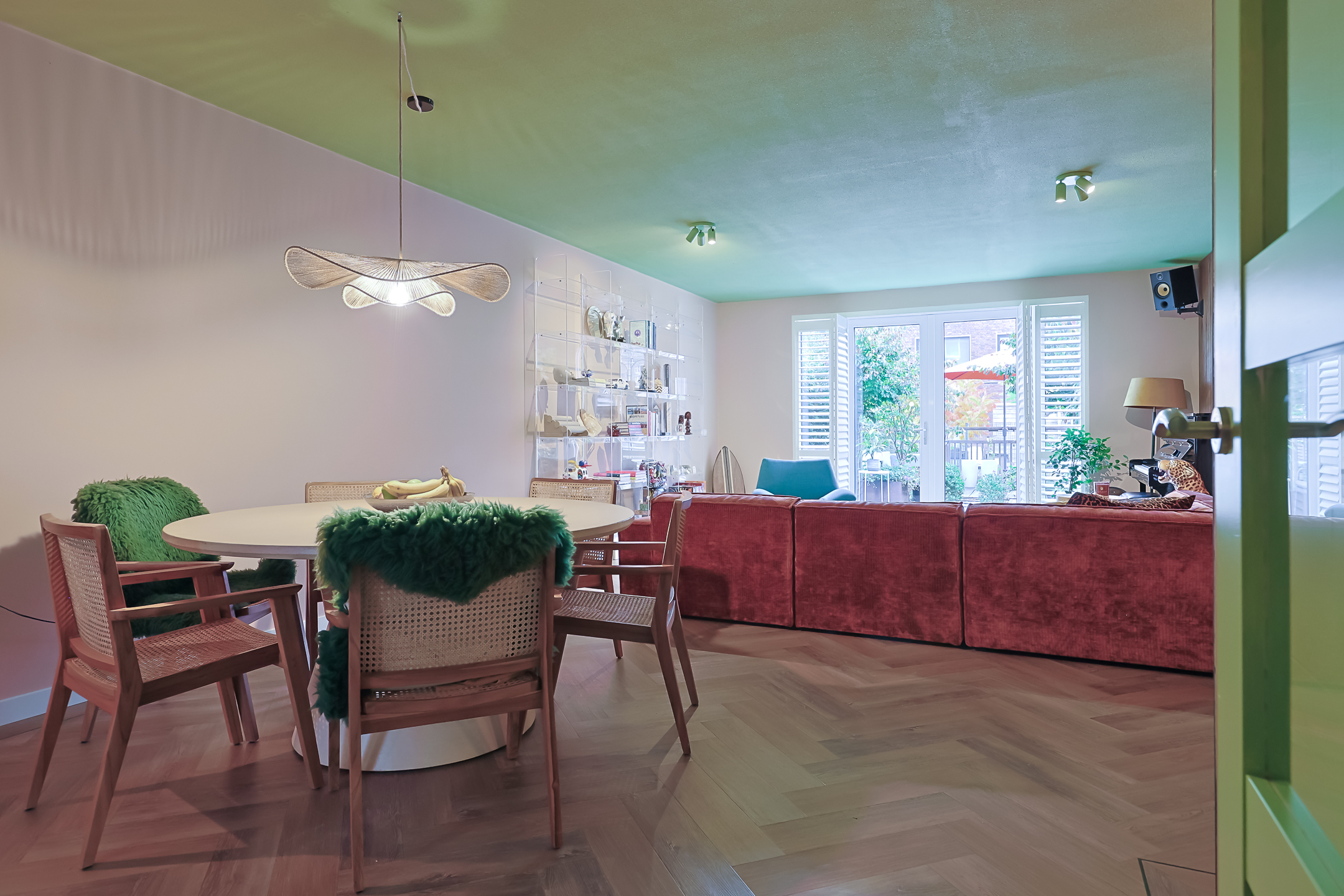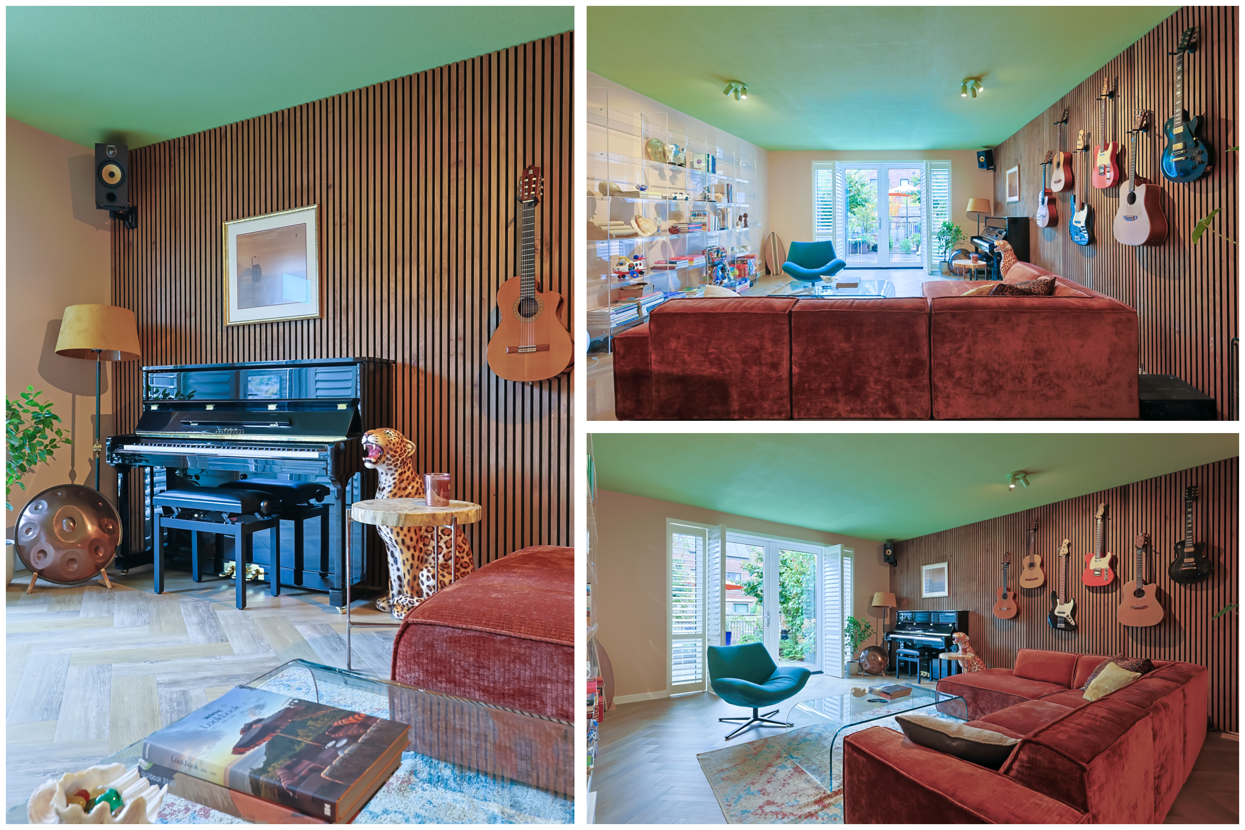 - Ruime, lichte woonkamer met visgraatvloer, vloerverwarming en grote ramen. Door de uitbouw is de woonkamer maar liefst 13 meter diep!