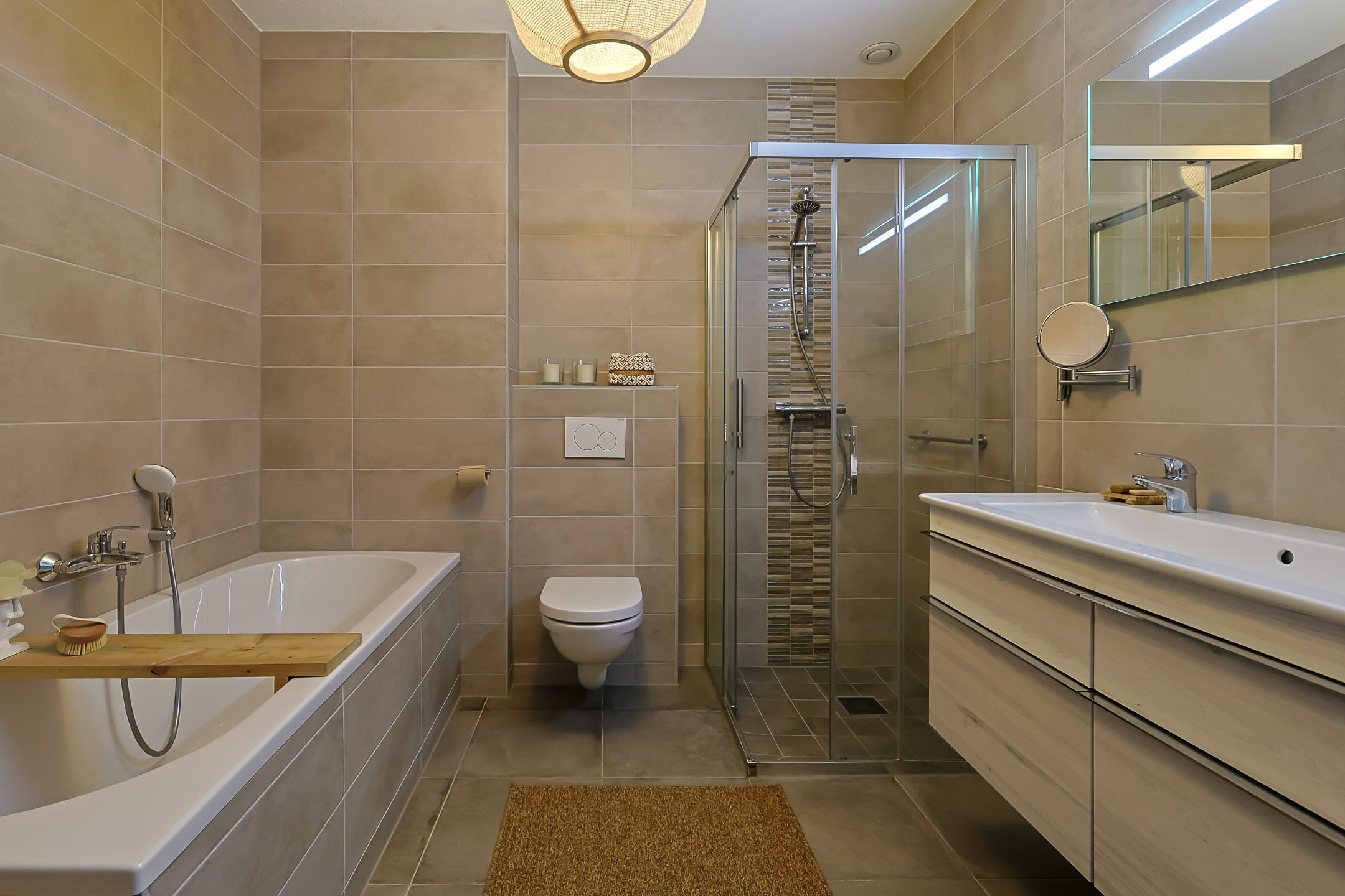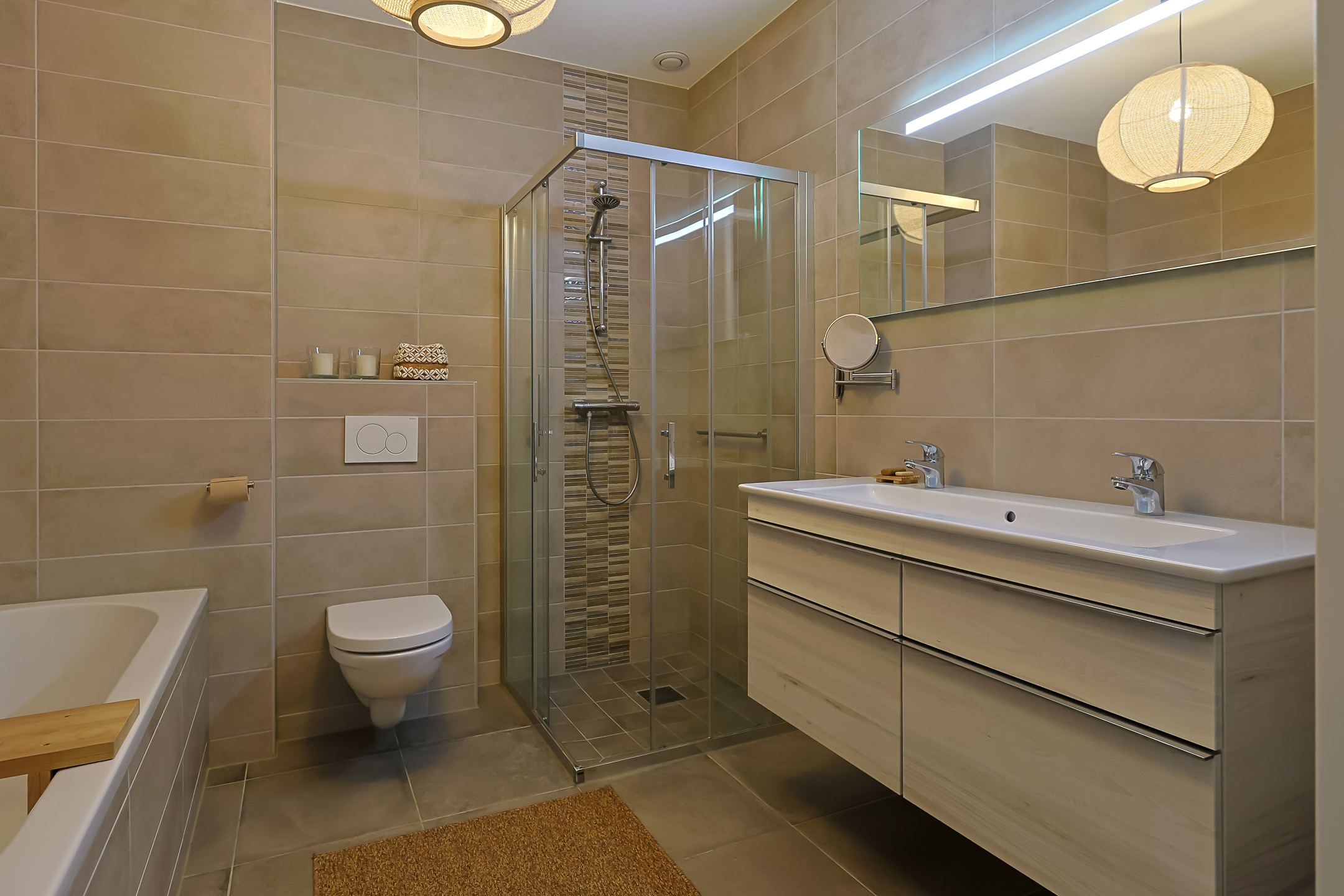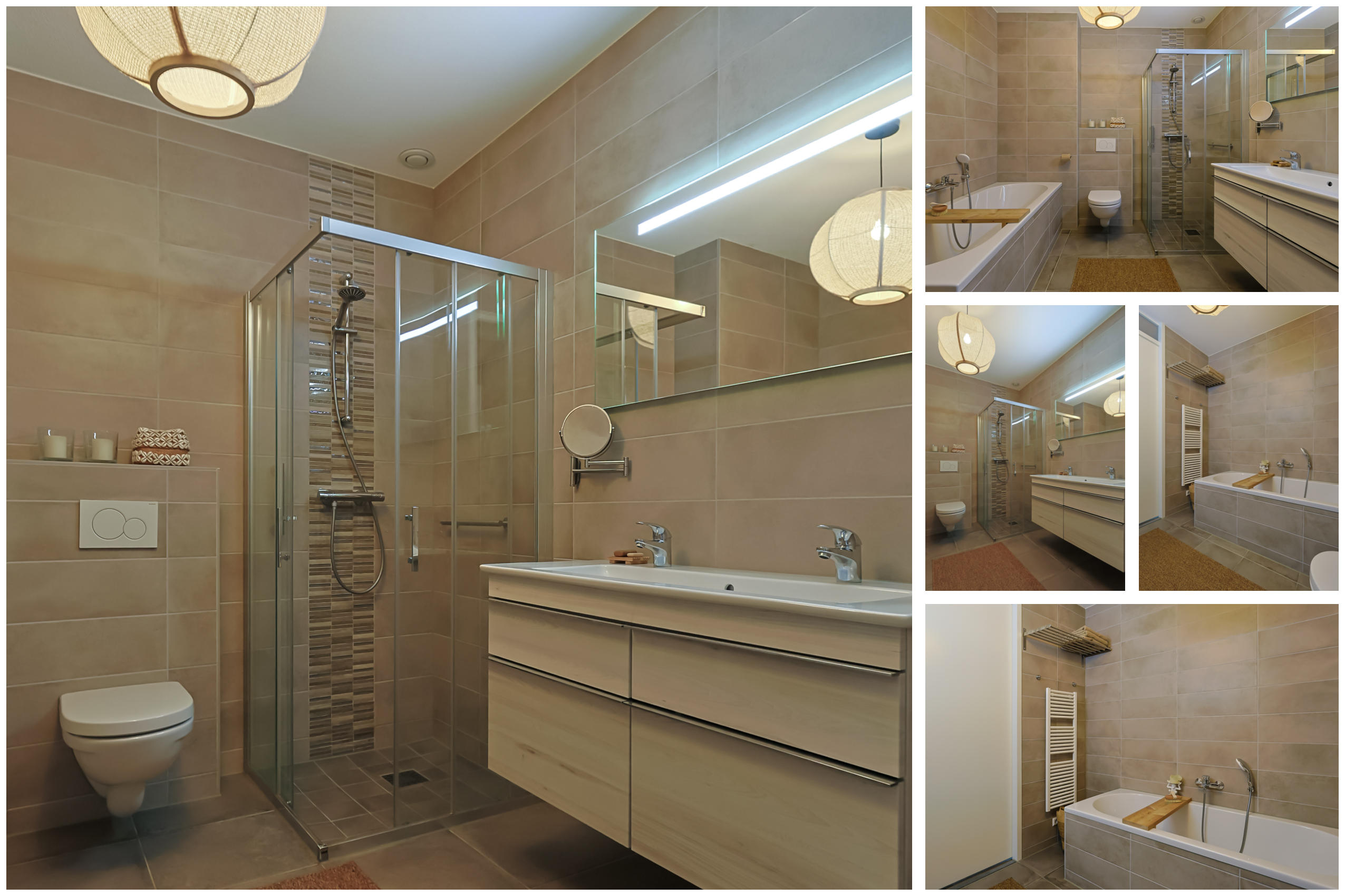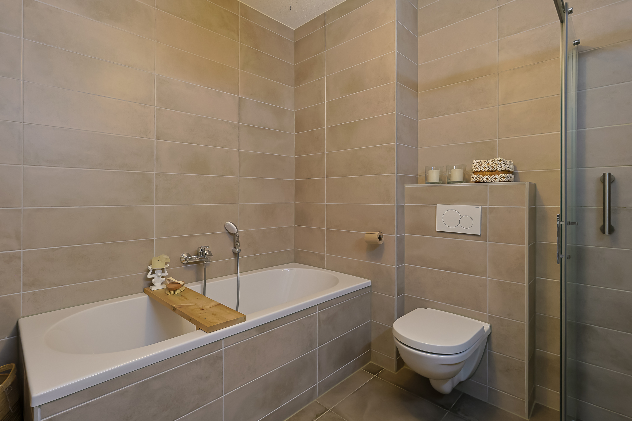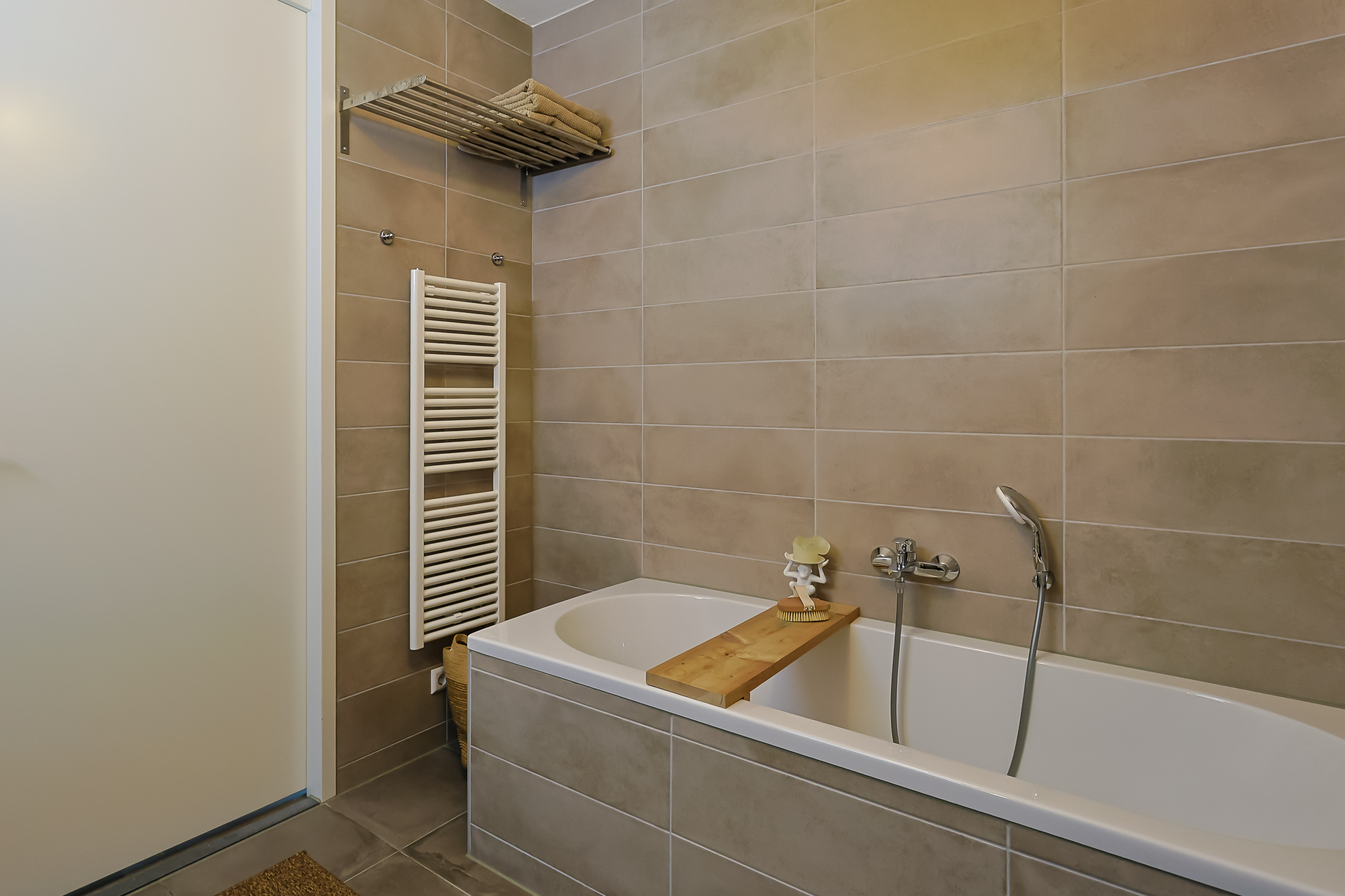 - Strak afgewerkte badkamer met moderne beige tegels. De badkamer beschikt over een ligbad, een dubbele wastafel in meubel, toilet en aparte douchecabine.