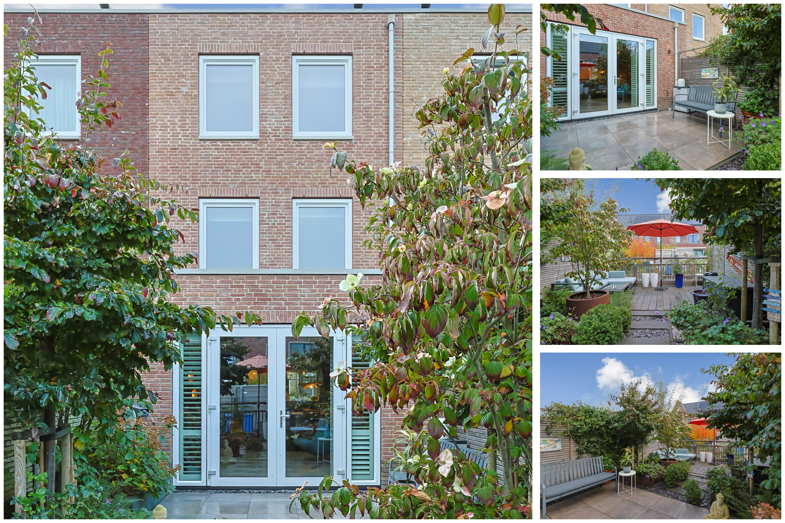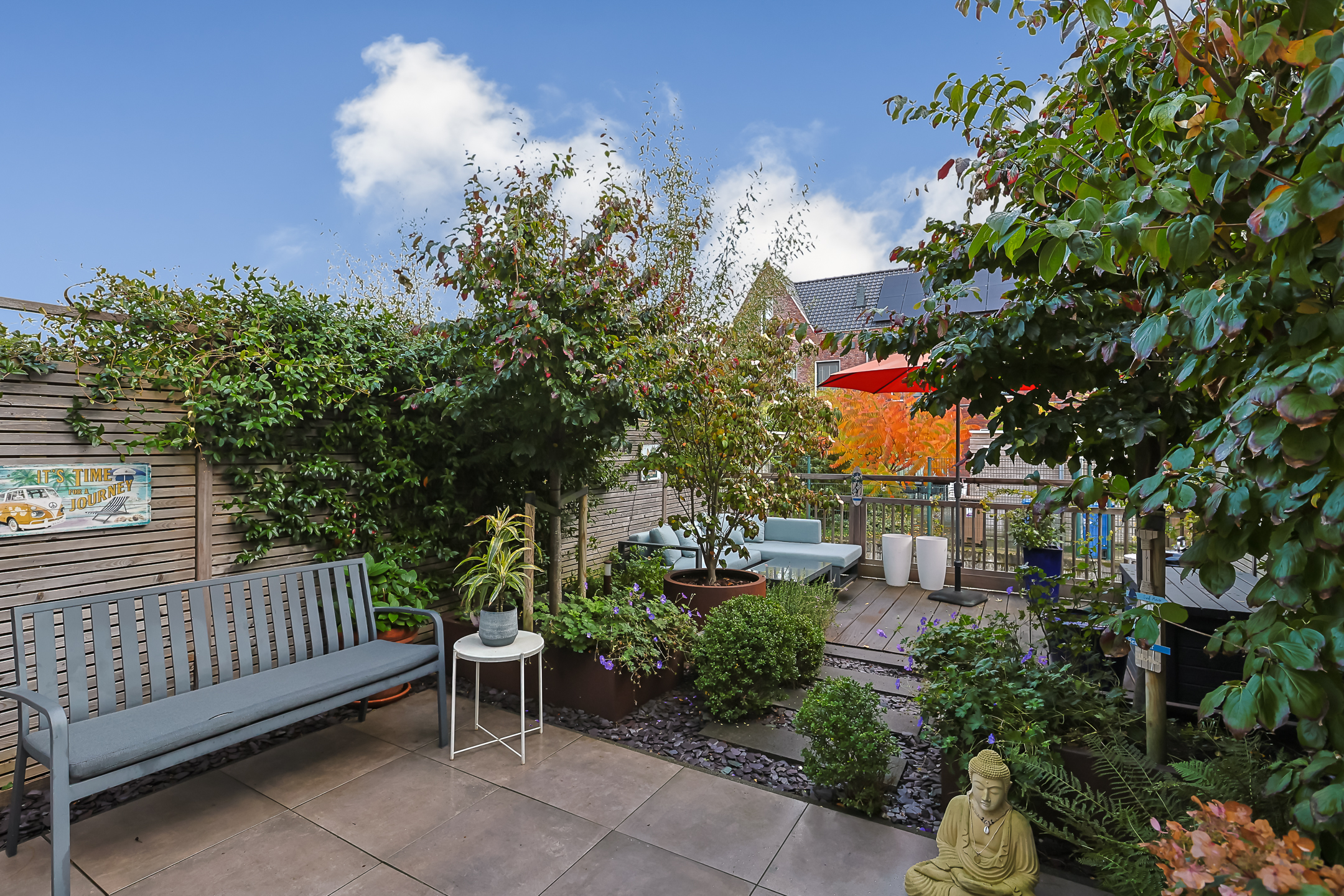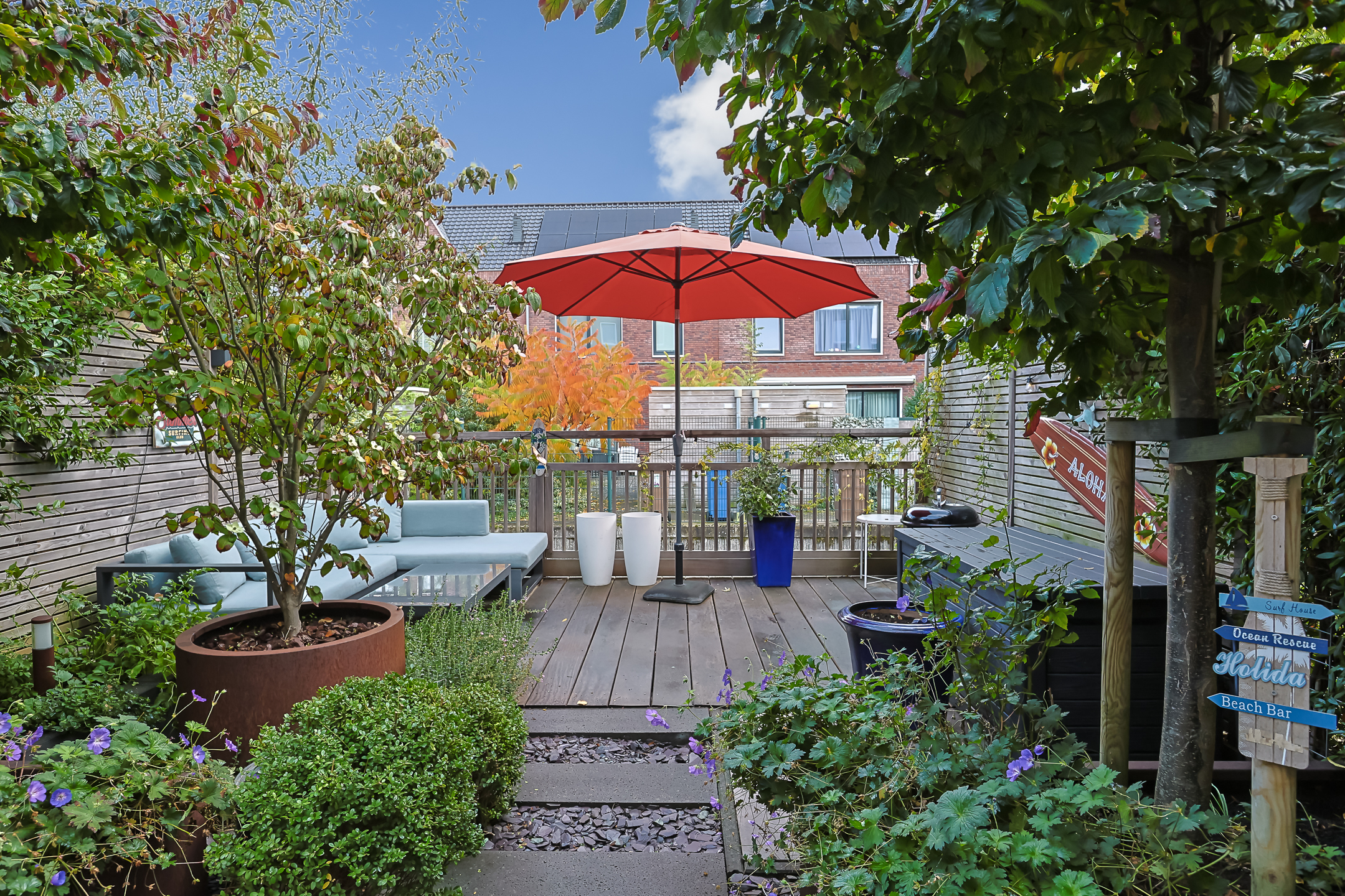 - De prachtige tuin is netjes aangelegde en goed onderhouden achtertuin, voorzien van grijze tegels, diverse groenborders, bloembakken van duurzaam cortenstaal en een houten vlonderterras.