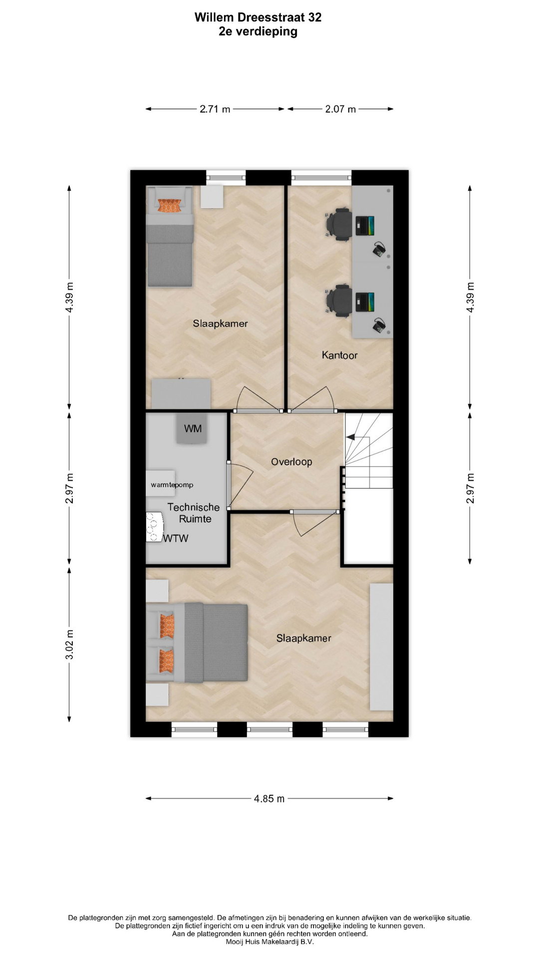 - Overloop met toegang tot drie slaapkamers en technische ruimte met warmtepomp, WTW-installatie, elektrische boiler en wasmachine-/drogeraansluiting.