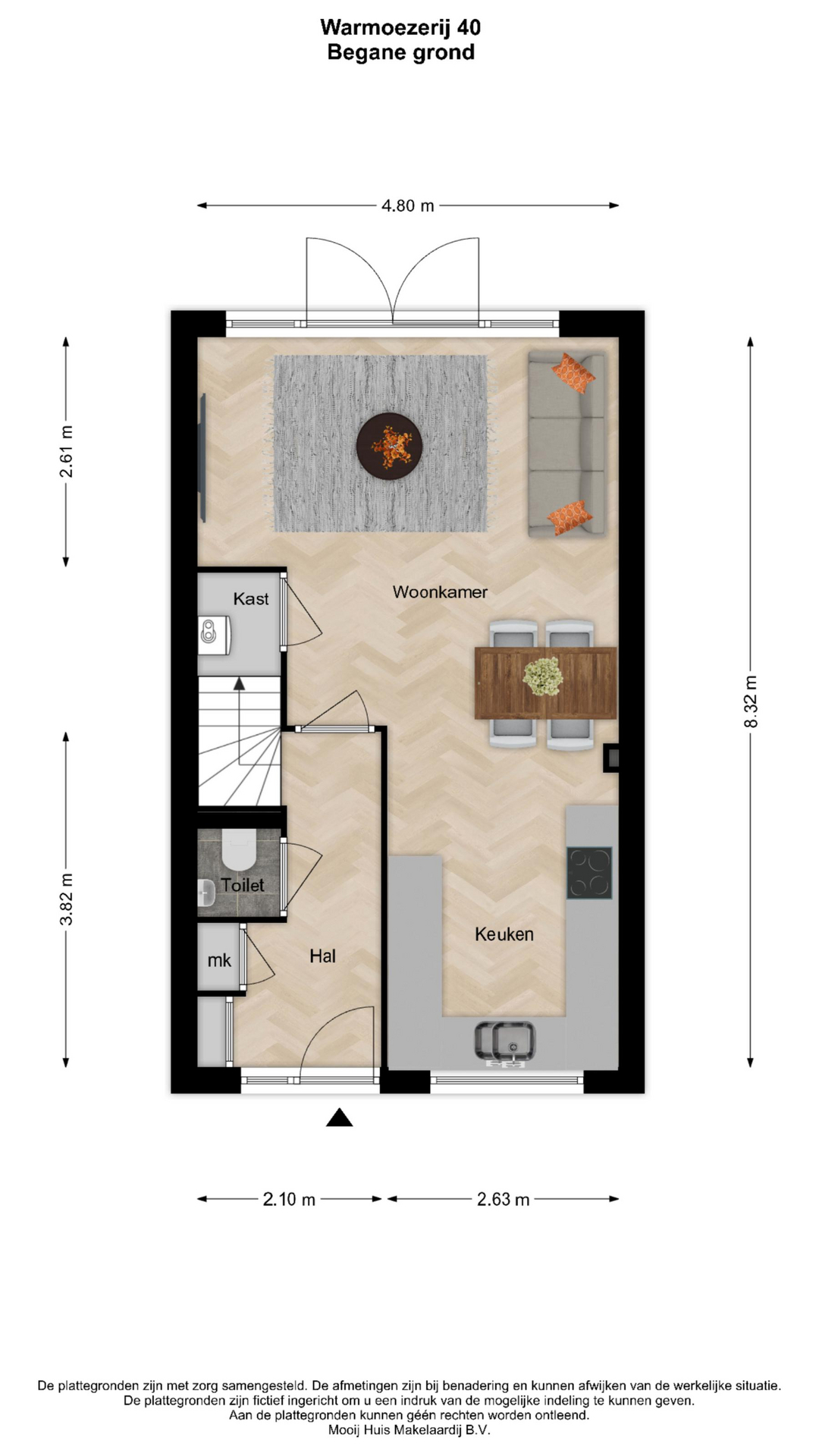 - Binnenkomst in de hal van de woning met plek voor de garderobe, meterkast en trapopgang naar de eerste verdieping. Tevens is er toegang tot de toiletruimte