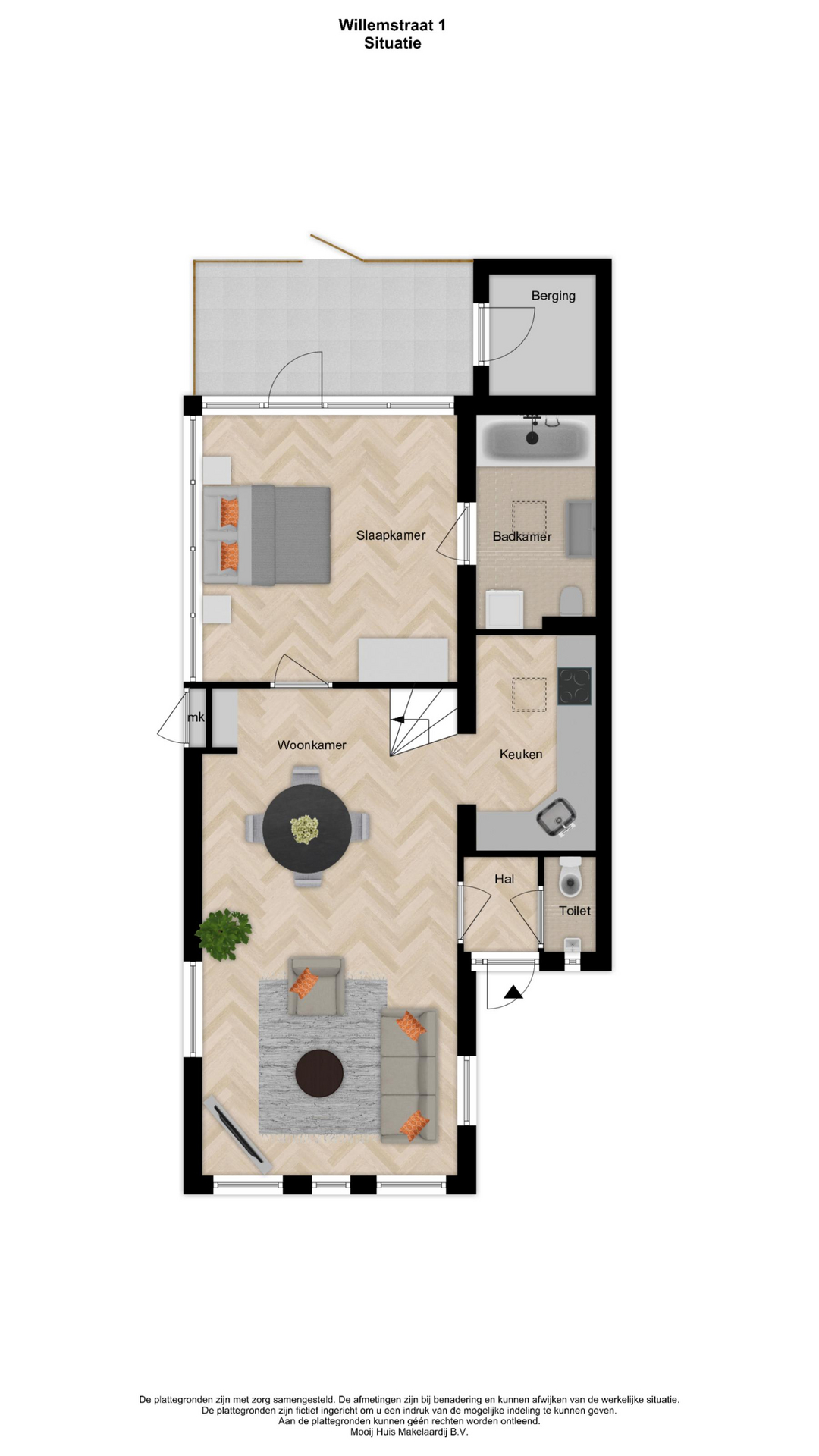 - Binnenkomst in de hal van de woning. De hal biedt voldoende ruimte voor een kapstok en geeft toegang tot de toiletruimte en woonkamer