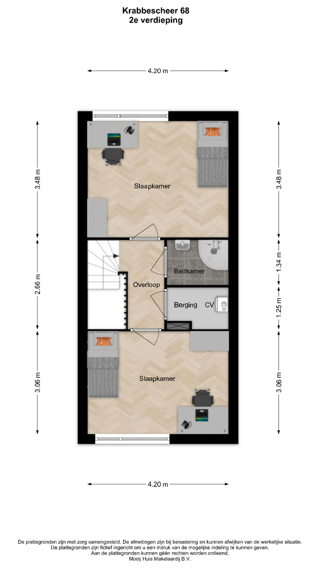 - De overloop van de tweede verdieping biedt toegang tot twee slaapkamers, de tweede badkamer en een stookruimte met opstelling van de CV-ketel