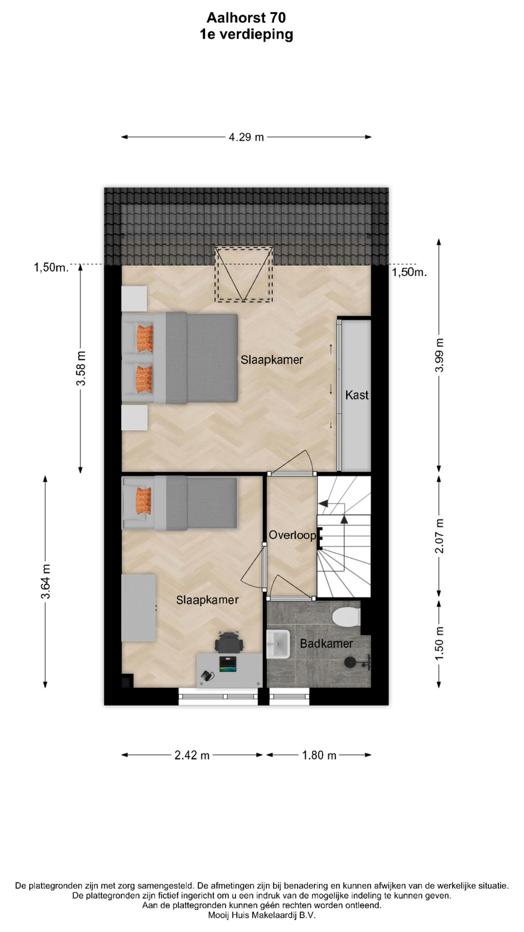 - De eerste verdieping bestaat uit twee slaapkamers en de badkamer. De grotere slaapkamer is gelegen aan de achterzijde van de woning en is voorzien van een vaste kastenwand, knieschotten voor extra bergruimte, een dakraam en airco. De andere slaapkamer is volwaardig van formaat en biedt genoeg ruimte voor een tweepersoonsbed