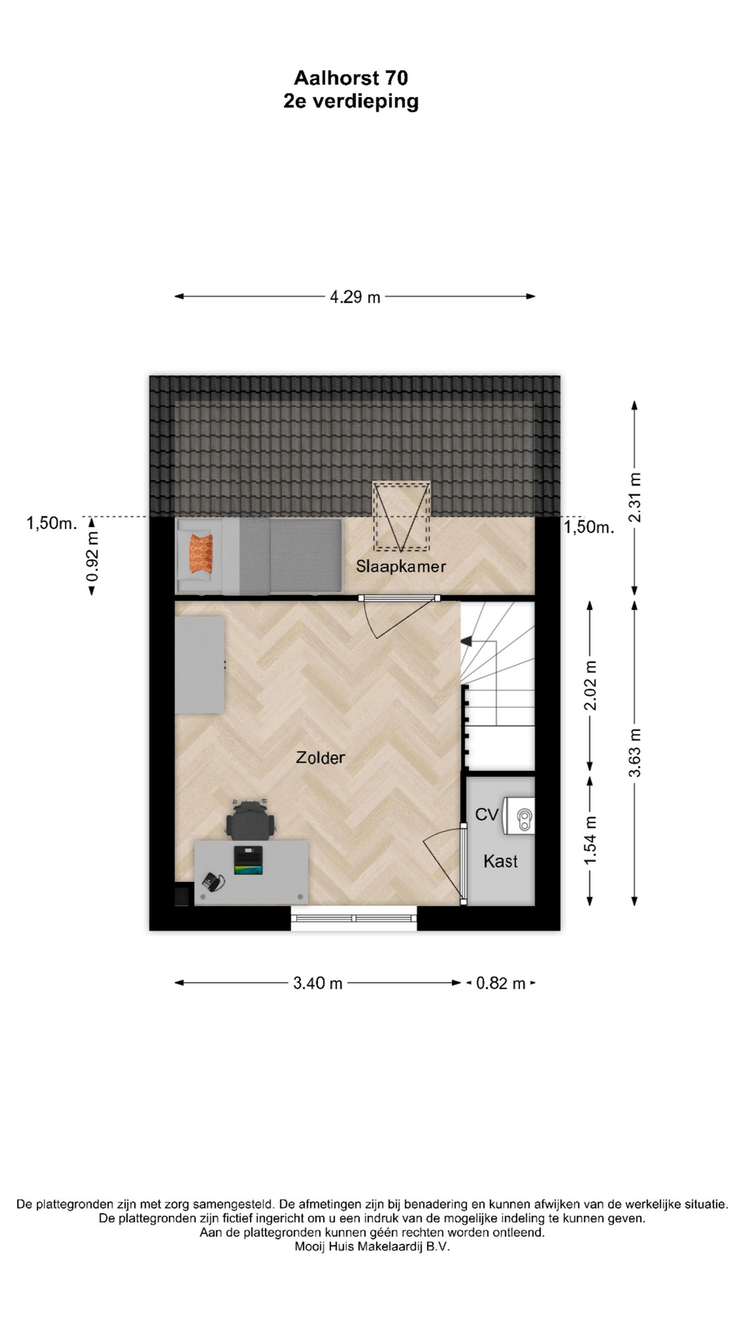 - De tweede verdieping beschikt over twee kamers, waarvan een slaapkamer en de zolderkamer. De grote zolderkamer biedt veel mogelijkheden tot het het creëren van extra slaapkamer(s) en is voorzien van airco. Tevens is hier via een deur toegang tot de vaste kast met opstelplaats van de CV-ketel (2023)