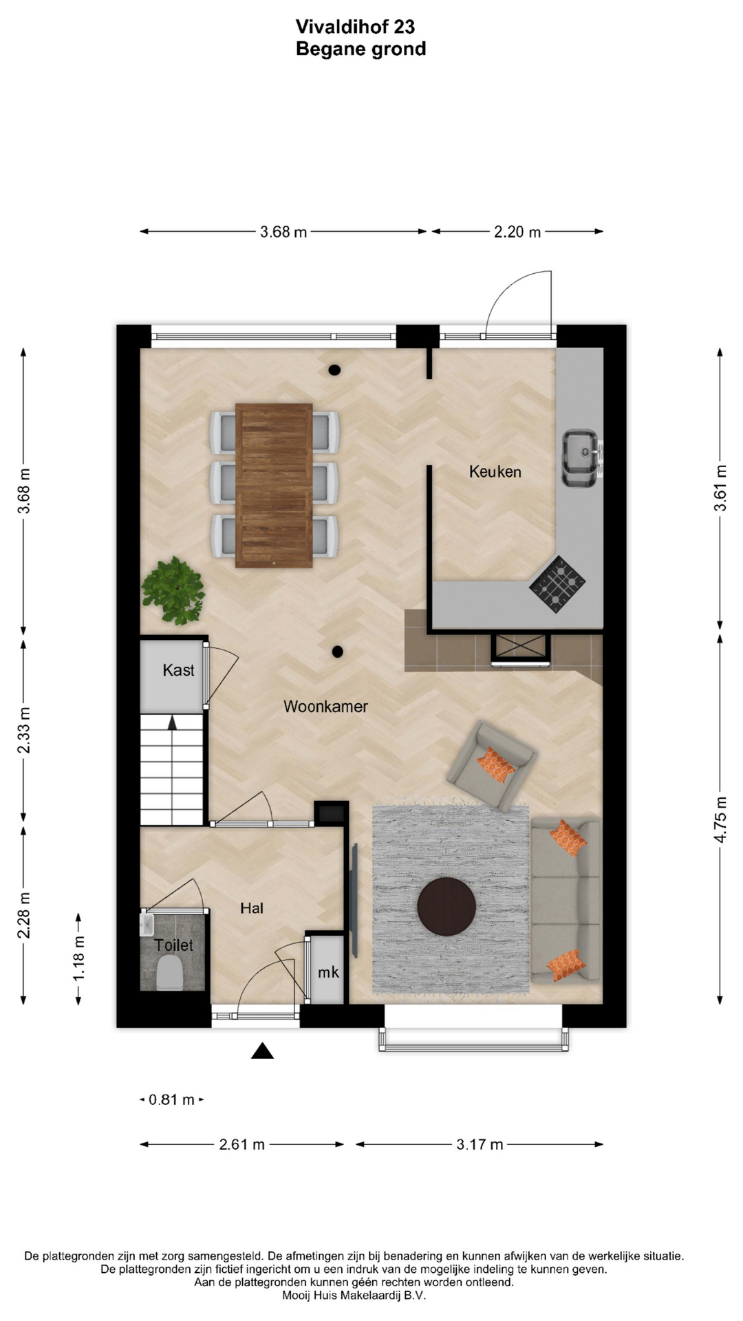 - De begane grond is afgewerkt met een massief eikenhouten vloer en neutrale wanden met stucwerk en behang. De vloer in de keuken is voorzien van tegels.